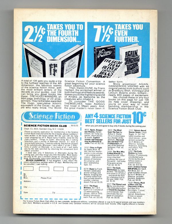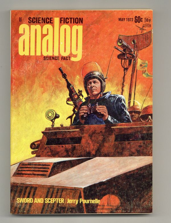 Published May 1973 by Dell Magazines.$10.00May 1973. Volume Misprinted as XCIII, should be XCI. Cover by Jack Gaughan. Stories: "Sword and Scepter"(Part 1) by Jerry Pournelle, "Naked to the Invisible Eye" by George Alec Effinger, "Survivability" by William Tuning, "How I lost the Second World War and Helped Turn Back the German Invasion" by Gene Wolfe, "With Morning Comes Mistfall" by George R. R. Martin, "An Agent in Place" by Laurence M. Janifer, and "The Great American Economy" by L. E. Modesitt, Jr. Science Fact article: "Minicomputers" by Stephen A. Kallis, Jr. Softcover, 5.5-in. x 7.5-in.; 178 newsprint pages, B&W. Cover price $0.60.
