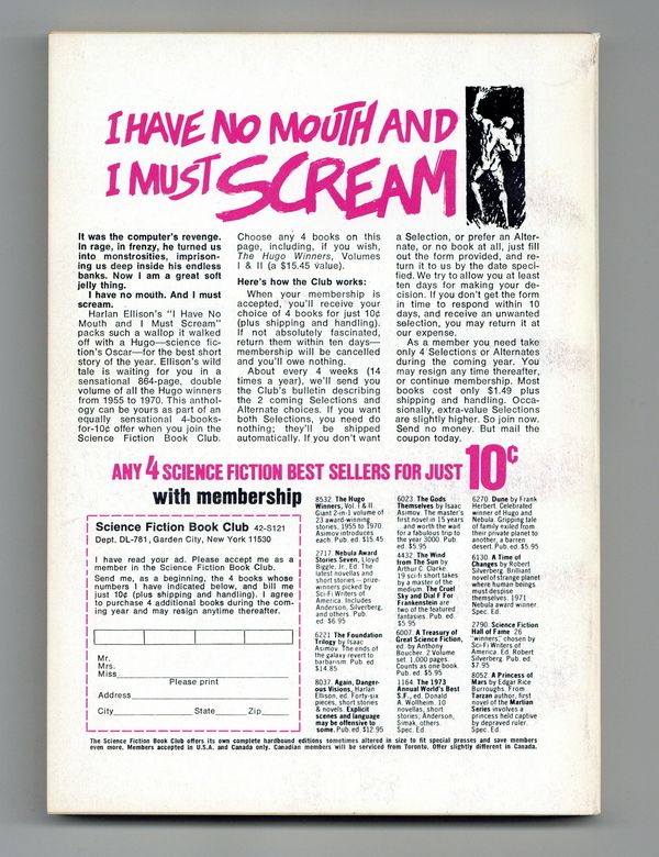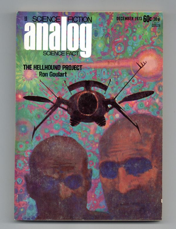 Published Dec 1973 by Dell Magazines.$10.50December 1973. Cover by John Schoenherr. Stories: "The Sins of the Fathers"(part 2) by Stanley Schmidt, "The Hellhound Project" by Ron Goulart, "Skinnerian Box" by Roger A. Beaumont, "Soldiers' Home" by Lawrence A. Perkins, and "Weed Killers" by Ronald Cain. Science Fact article: "Beyond the Blue" by Walter B. Hendrickson, Jr. Softcover, 5.5-in. x 7.5-in.; 178 newsprint pages, B&W. Cover price $0.60.