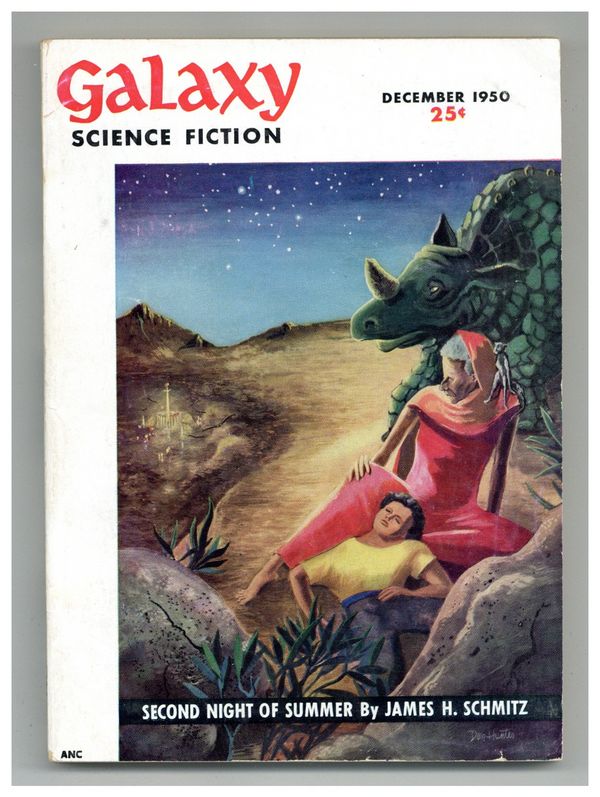 Published Dec 1950 by Galaxy Publications.$5.00December 1950. Cover by Don Hunter. Stories: "Time Quarry"(Conclusion) by Clifford D. Simak, "Second Night of Summer" by James H. Schmitz, "A Stone and a Spear" by Raymond F. Jones, "Judas Ram" by Sam Merwin, Jr., "Jaywalker" by Ross Rocklynne, and "The Waker Dreams" by Richard Matheson. Article: "Twenty-Foot Miss" by Willy Ley. 5.25-in. x 7.5-in.; 160 Pages, B&W. Cover price $0.25.