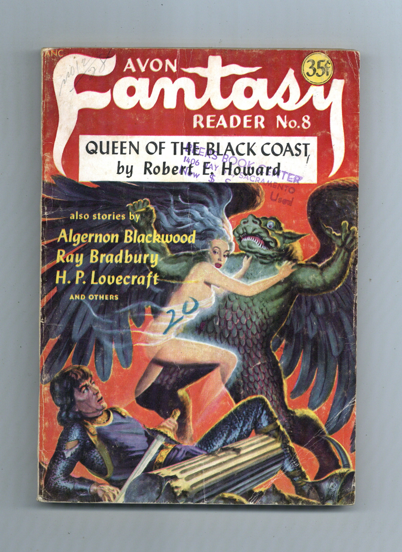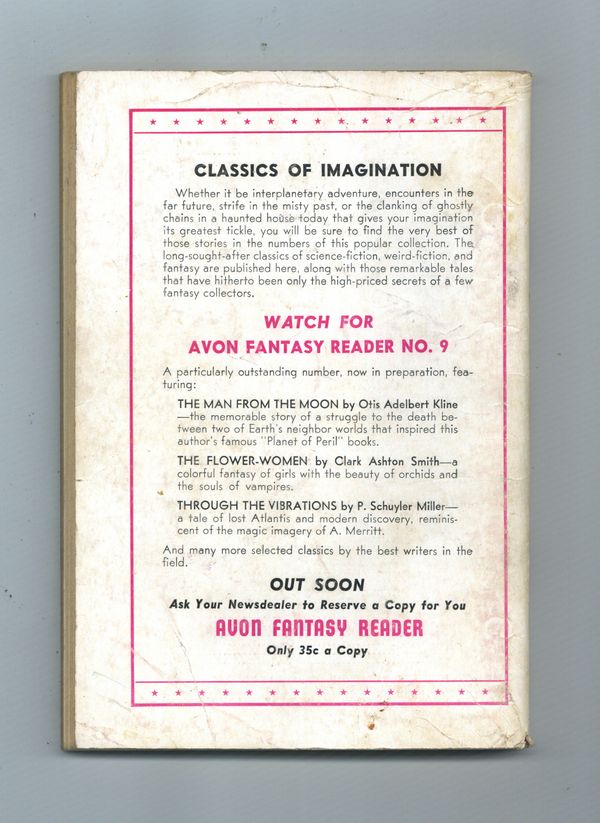 Published Nov 1948 by Avon Books.$20.00November, 1948. "The Queen of the Black Coast!" Written by Robert E. Howard. Featuring work by Ray Bradbury, Algernon Blackwood, and 'The Temple" by H. P. Lovecraft. Softcover, 5-in. x 7 1/2-in., 132pages, Text with B&W illustations. Cover price $0.35.