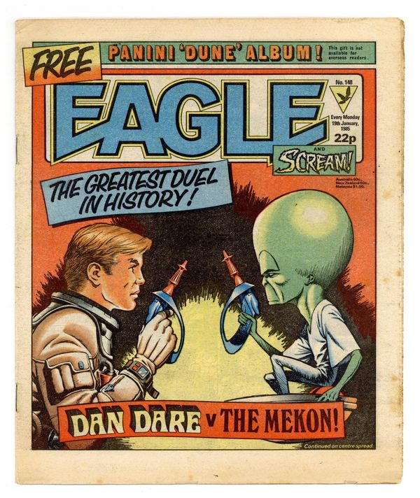 Published Jan 1985 by IPC Magazines.$4.60January 19th, 1985. Dan Dare, plus other features. Published in the United Kingdom, 8-1/2-in. x 11-1/2-in, 32-pages including cover, all newsprint stock. Mix of color and black/white interior. NOTE: Does not include Panini 'Dune' Sticker Album (sold separately).