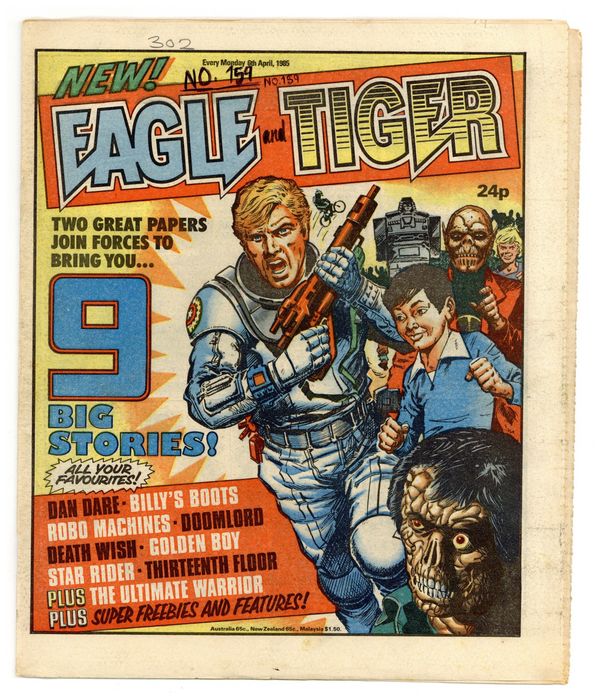 Published Apr 1985 by IPC Magazines.$9.00NOTE: Title becomes Eagle and Tiger #159-221 - April 6th, 1985. (not numbered) 1st issue of Eagle and Tiger papers combining into one paper. Published in the United Kingdom, 8-1/2-in. x 11-1/2-in, 32-pages including cover, all newsprint stock. Mix of color and black/white interior.