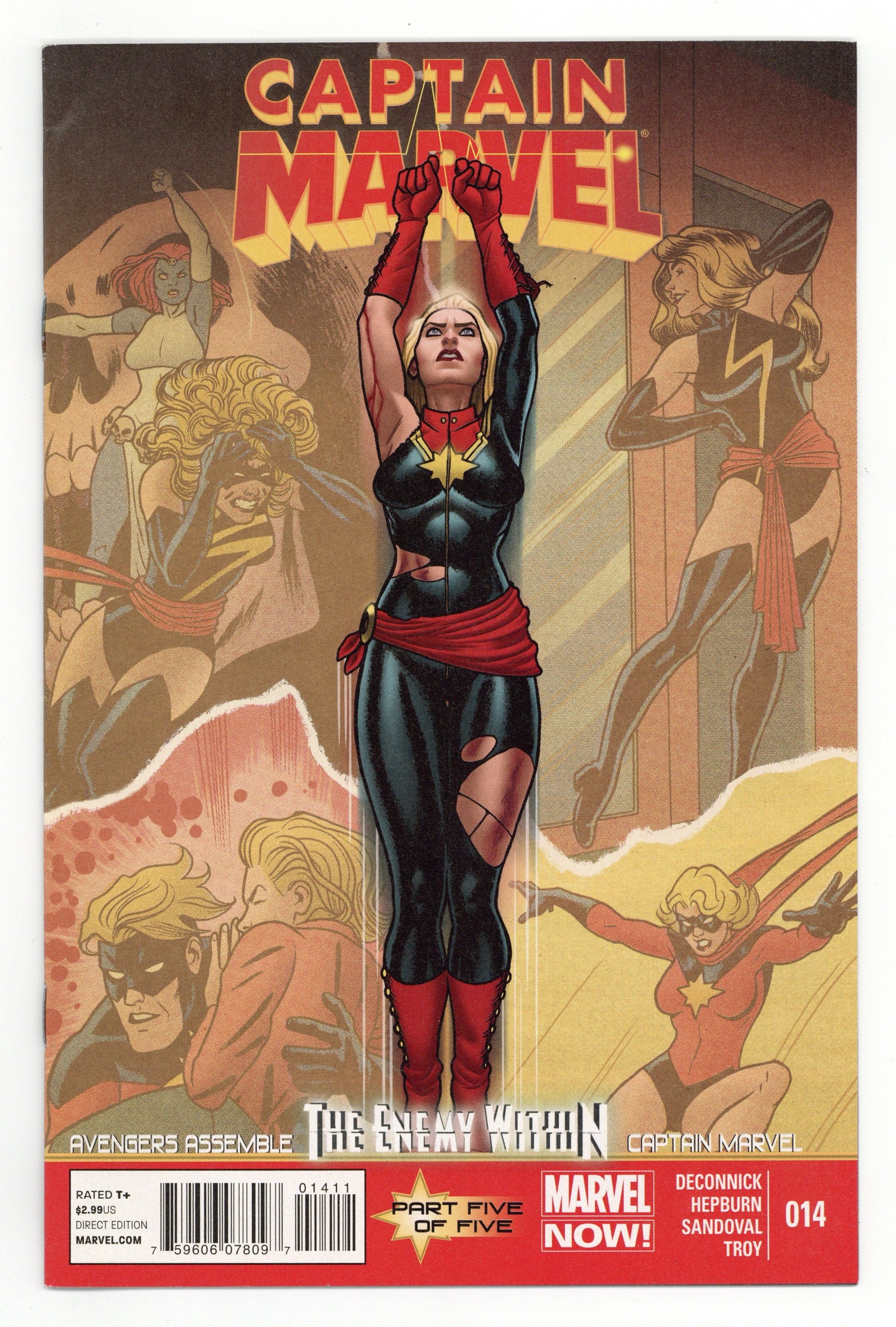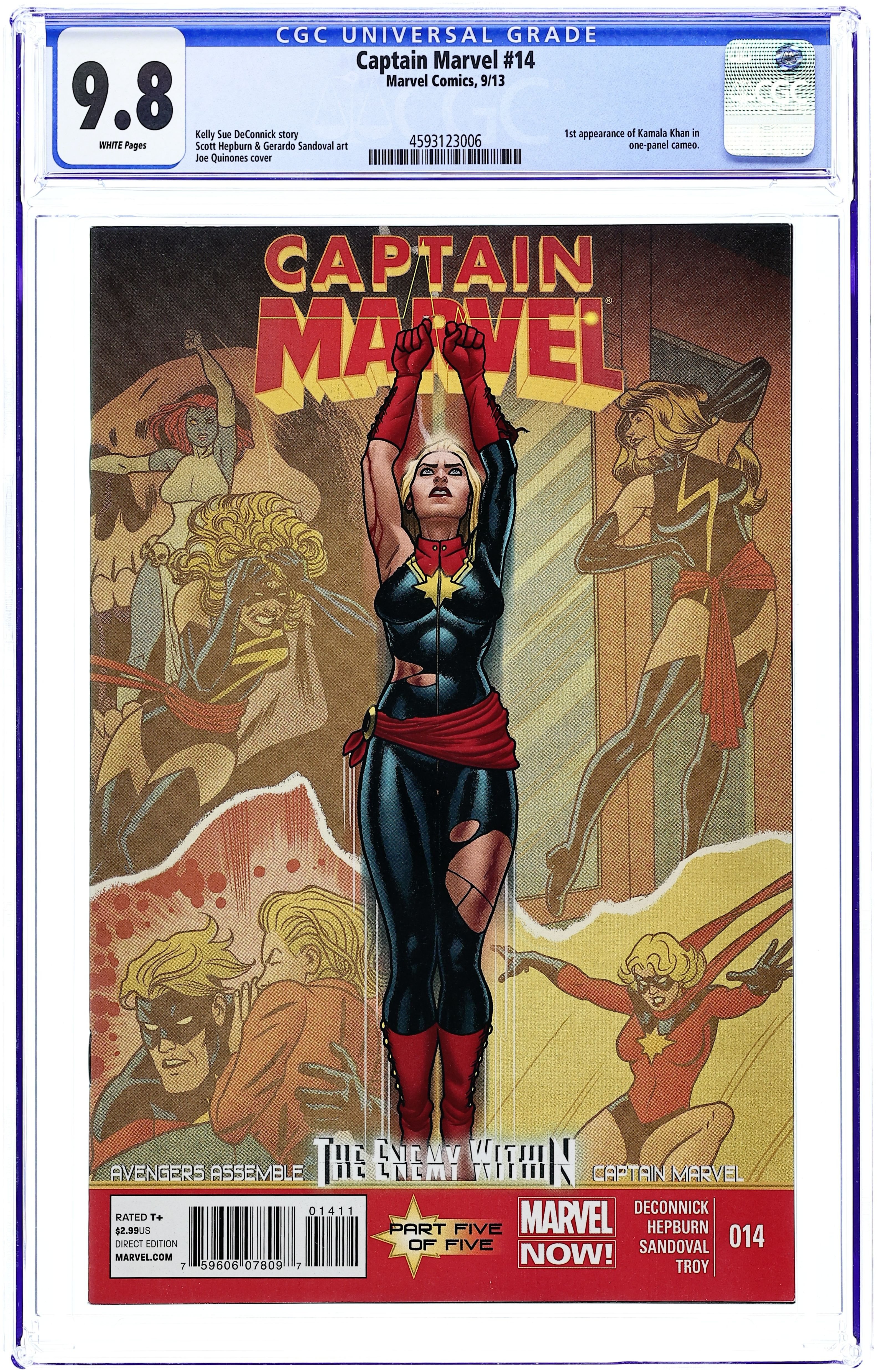 Tags: Avengers Enemy Within (part 5), Marvel Legacy Numbering: Captain Marvel (part 87), Avengers, Marvel NOW (2013)$150.00Direct Edition. "THE ENEMY WITHIN " Part 5 of 5 Written by Kelly Sue DeConnick. Art by Scott Hepburn. Cover by Joe Quinones. Captain Marvel will end Magnitron's reign. Note: First appearance of Kamala Khan (2nd Ms. Marvel). Cover price $2.99.