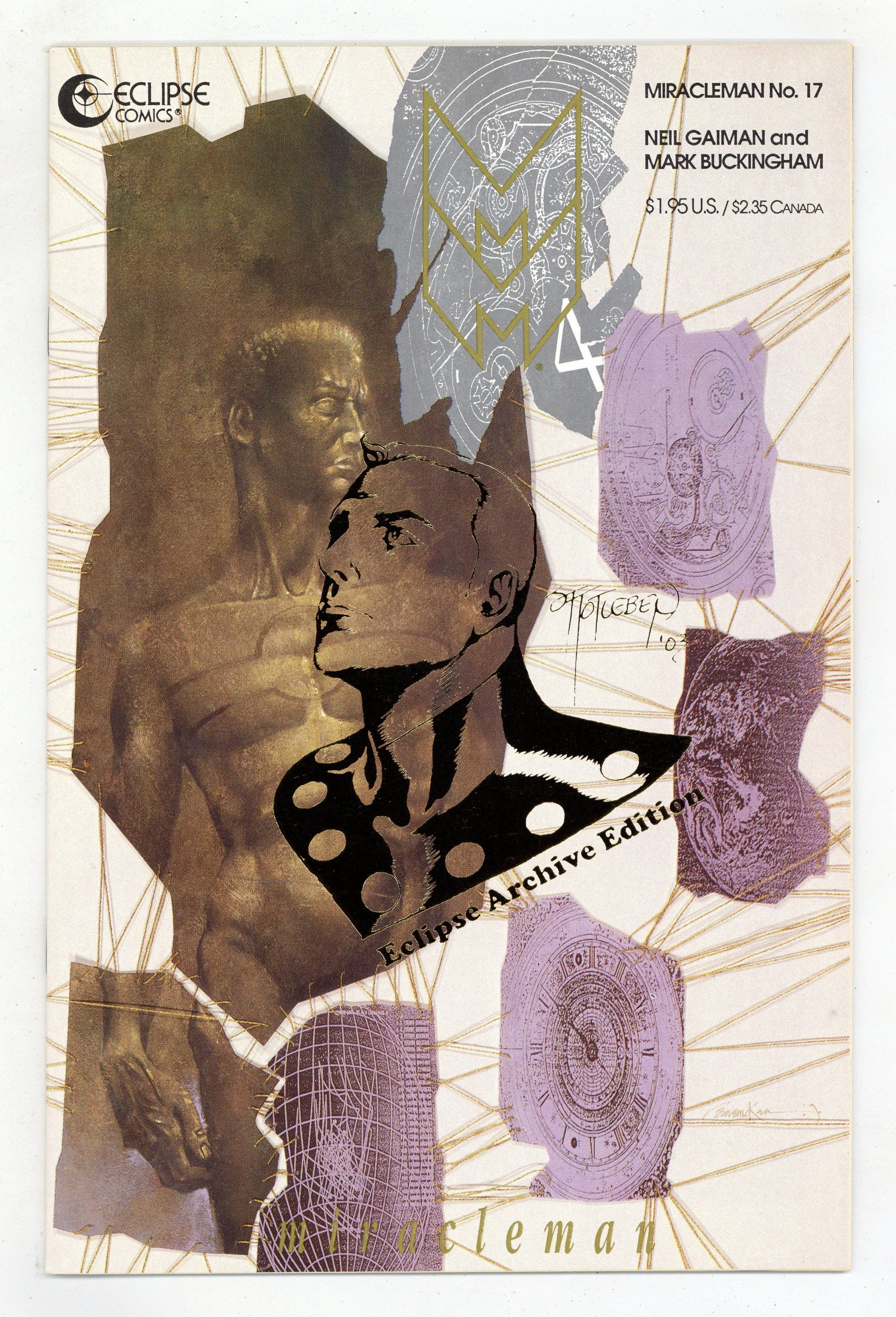 Gold Foil Eclipse Comics Archive Edition with certificate of authenticity. This copy of Miracleman #17 is from uncirculated inventory purchased exclusively by New Dimension Comics. It features a John Totleben Foil Cover with never-before-seen artwork. Only 199 copies exist. Neil Gaiman script; Mark Buckingham art. 1st Gaiman work on the title. Cover price $1.95.