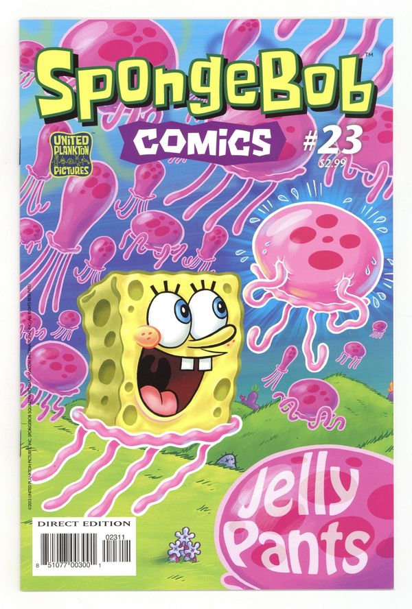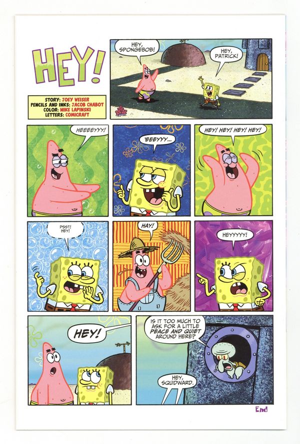 Published Jul 2013 by United Plankton Pictures.$36.00(W) Joey Weiser (A) Gregg Schigiel, Israel Sanchez (CA) Jacob Chabot Meet Jay Lee Huntar - jellyfish hunter extraordinaire and wearer of pith helmets! In 'The Jellyfishing Master,' Patrick and SpongeBob can only watch in horror as this interloper's traps capture the entire jelly population of Jellyfish Fields. Who or what can save the jellies...and SpongeBob's favorite sport? Then in 'The Critic,' a restaurant reviewer's visit to the Krusty Krab forces SpongeBob to pull out all the stops, kick out the jams, AND go the whole nine yards to make the most amazing Krabby Patties ever. But what can even SpongeBob do when ingredients run out? Also in this issue: SpongeBob runs a race, Patrick grows a mustache, and Sandy learns a thing or two about playing cards with idiots! All this and a beach scene pin-up of Goo Lagoon in the full swing of summer!" Cover price $2.99.