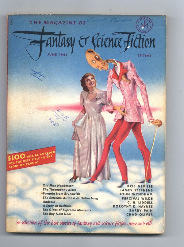 Published Jun 1951 by Mercury Publications.$14.25June 1951. Fantasy and Science fiction stories: "Old Man Henderson" by Kris Neville, "The Threepenny-Piece" by James Stephens, "Love Story" by Kay Rogers, "Bargain from Brunswick" by John Wyndham, "Scrap Iron" by Larry Sternig, "The Boy Next Door" by Chad Oliver, "The Twilight Planet" by Arthur J. Cox, "The Extreme Airiness of Duton Lang" by Percival Wilde, "?" by Ford McCormack, "The Glass of Supreme Moments" by Barry Pain, "'Twas Brillig..." by Evan H. Appelman, "Android" by C.H. Liddell, "A Story at Bedtime" by Dorothy K. Haynes. Softcover, 5.5-in. x 7.5-in.; 132 pages, B&W. Cover price $0.35.
