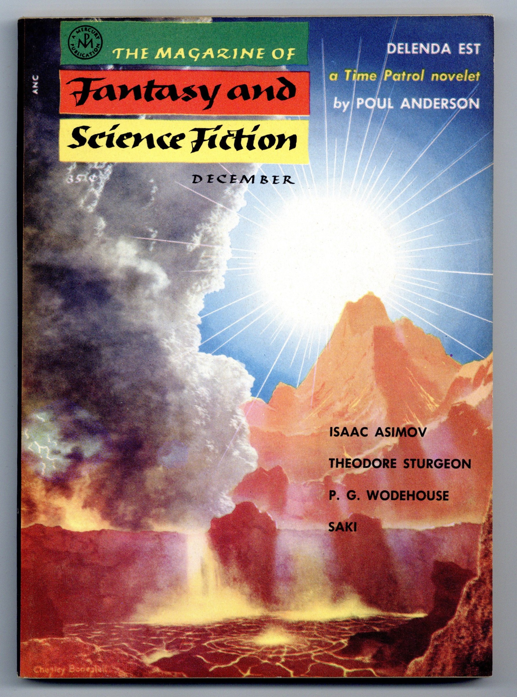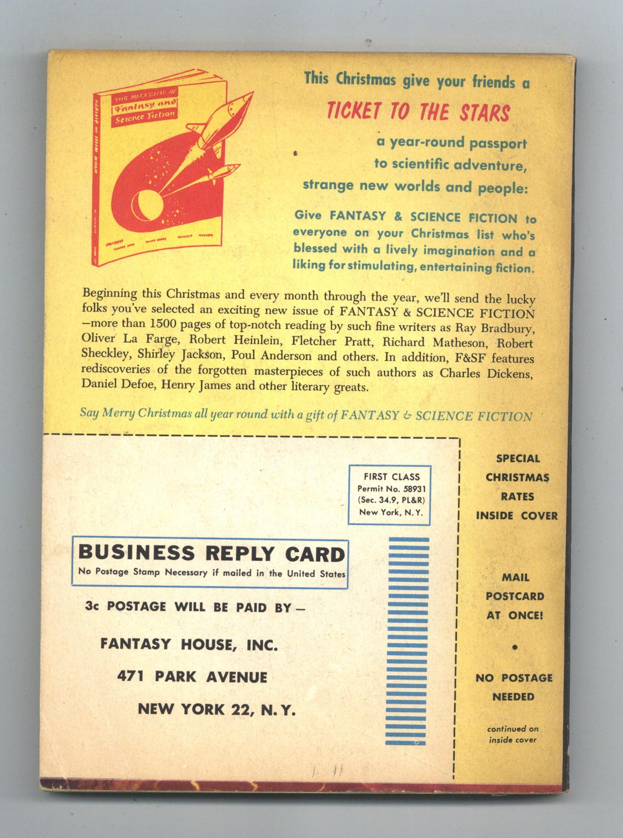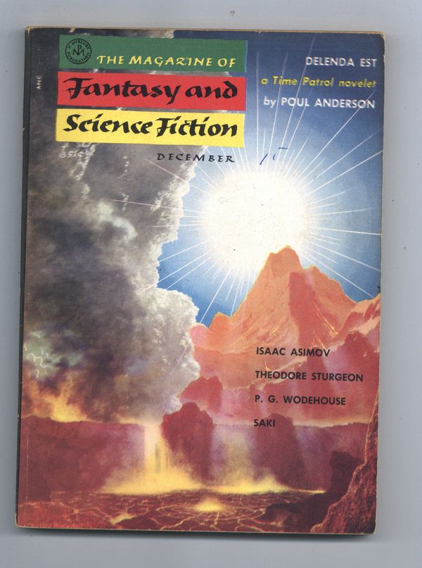 Published Dec 1955 by Mercury Publications.$7.80December 1955. Cover by Chesley Bonestell. Fantasy and science fiction stories: "Delenda Est" by Poul Anderson, "Mellonta Tauta" by Edgar Allan Poe, "The Day After We Land on Mars" by Robert S. Richardson, "Dreaming Is a Private Thing" by Isaac Asimov, "The Science Screen" by Charles Beaumont, "Blaze of Glory" by Randall Garrett, "The Hedgehog" by Saki, "Interview" by Bird Ferguson, "Of the People" by Gordon R. Dickson, "Mulliner's Buck-U-Uppo" by P.G. Wodehouse, "The [Widget], the [Wadget], and Boff" by Theodore Sturgeon. Softcover, 5.5-in. x 7.5-in.; 132 pages, B&W. Cover price $0.35.