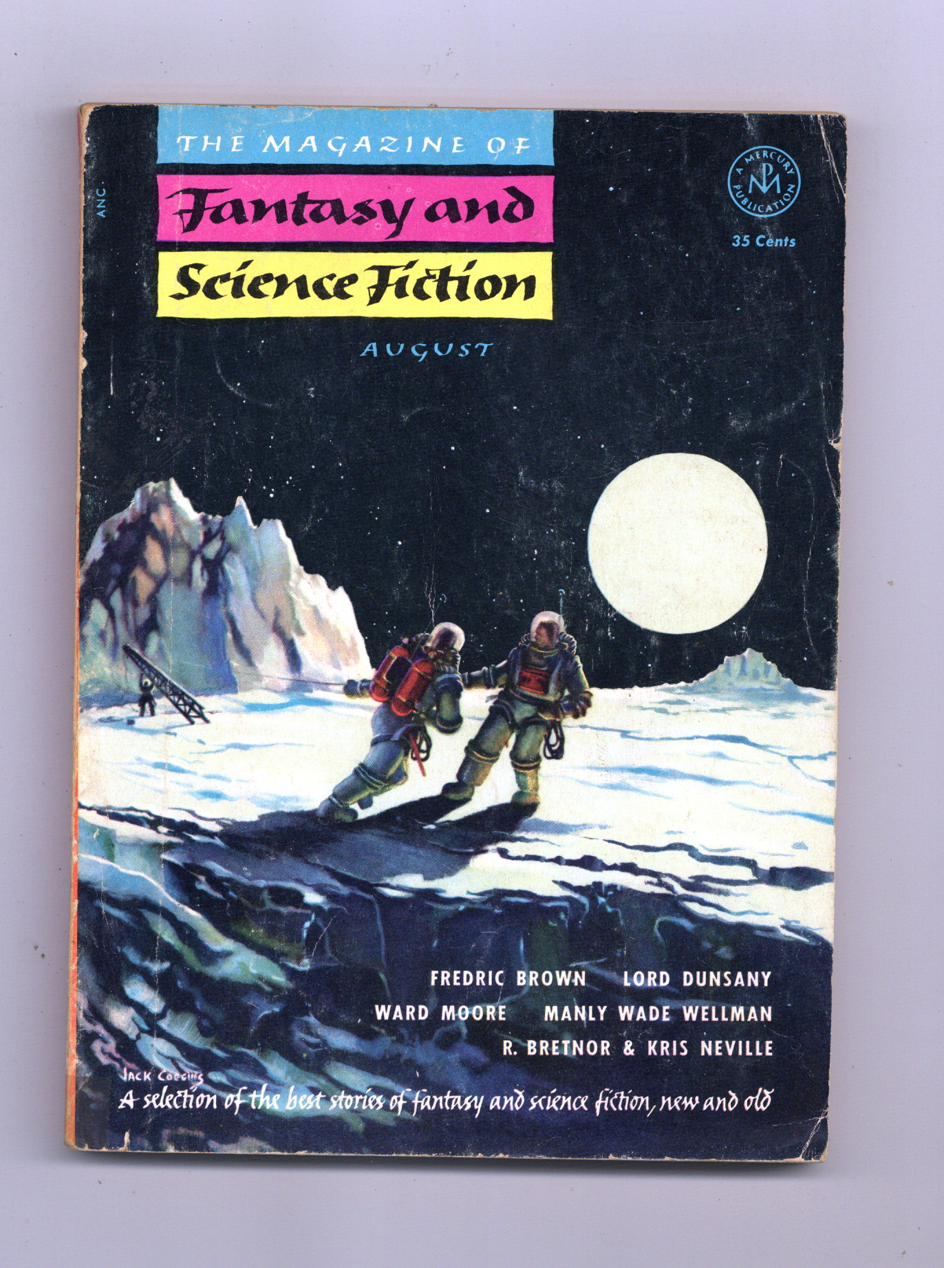 Published Aug 1953 by Mercury Publications.$3.00August 1953. Cover by Jack Coggins. Fantasy and science fiction stories: "Gratitude Guaranteed" by R. Bretnor and Kris Neville, "Rustle of Wings" by Fredric Brown, "Mr. Kinkaid's Pasts" by J.J. Coupling, "One Other" by Manly Wade Wellman, "MS Found in a Vacuum" by P.M. Hubbard, "Captive Audience" by Ann Warren Griffith, "Measure of a Man" by Ward Moore, "Told Under Oath" by Lord Dunsany, "Open Ears" by Ralph Robin, "Randall" by Lavinia R. Davis, "The Cerebrative Psittacoid" by H. Nearing, Jr. "At the Door" by Ben Ray Redman, "A Warning to the Furious" by Eando Binder. Softcover, 5.5-in. x 7.5-in.; 132 pages, B&W. Cover price $0.35.