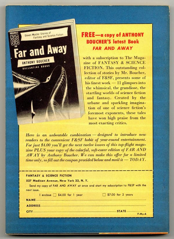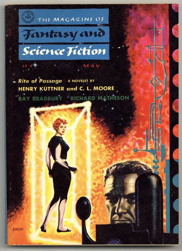 Published May 1956 by Mercury Publications.$6.00May 1956. Cover by Emsh. Fantasy and science fiction stories: "Rite of Passage" by Henry Kuttner and C.L. Moore, "Mr. Coward Gets There First" by Anthony Brode, "Technological Retreat" by G.C. Edmondson, "Of Mars and Men: Nice Girls on Mars" by Poul Anderson, "Of Mars and Men: News for Dr. Richardson" by Miriam Allen DeFord, "Steel" by Richard Matheson, "Machina Ex Machina" by Willard Marsh, "Emergency Operation" by Arthur Porges, "The Barbarian" by Poul Anderson, "The Pliable" by Daniel F. Galouye, "Icarus Montgofier Wright" by Ray Bradbury. Softcover, 5.5-in. x 7.5-in.; 128 newsprint pages, B&W. Cover price $0.35.