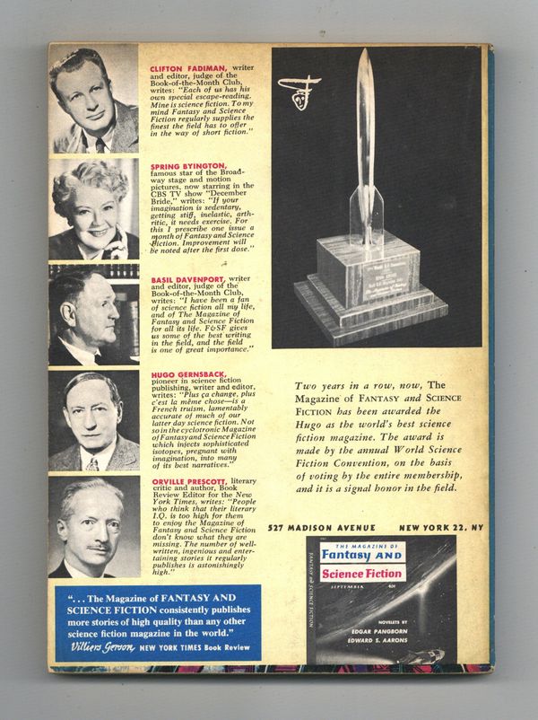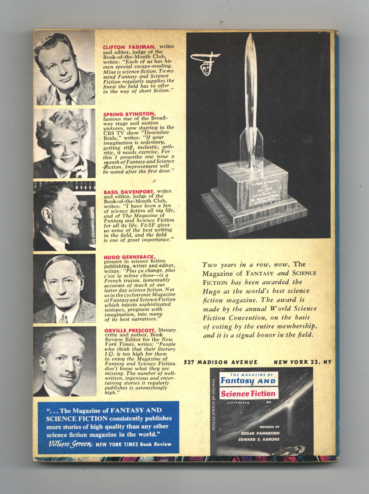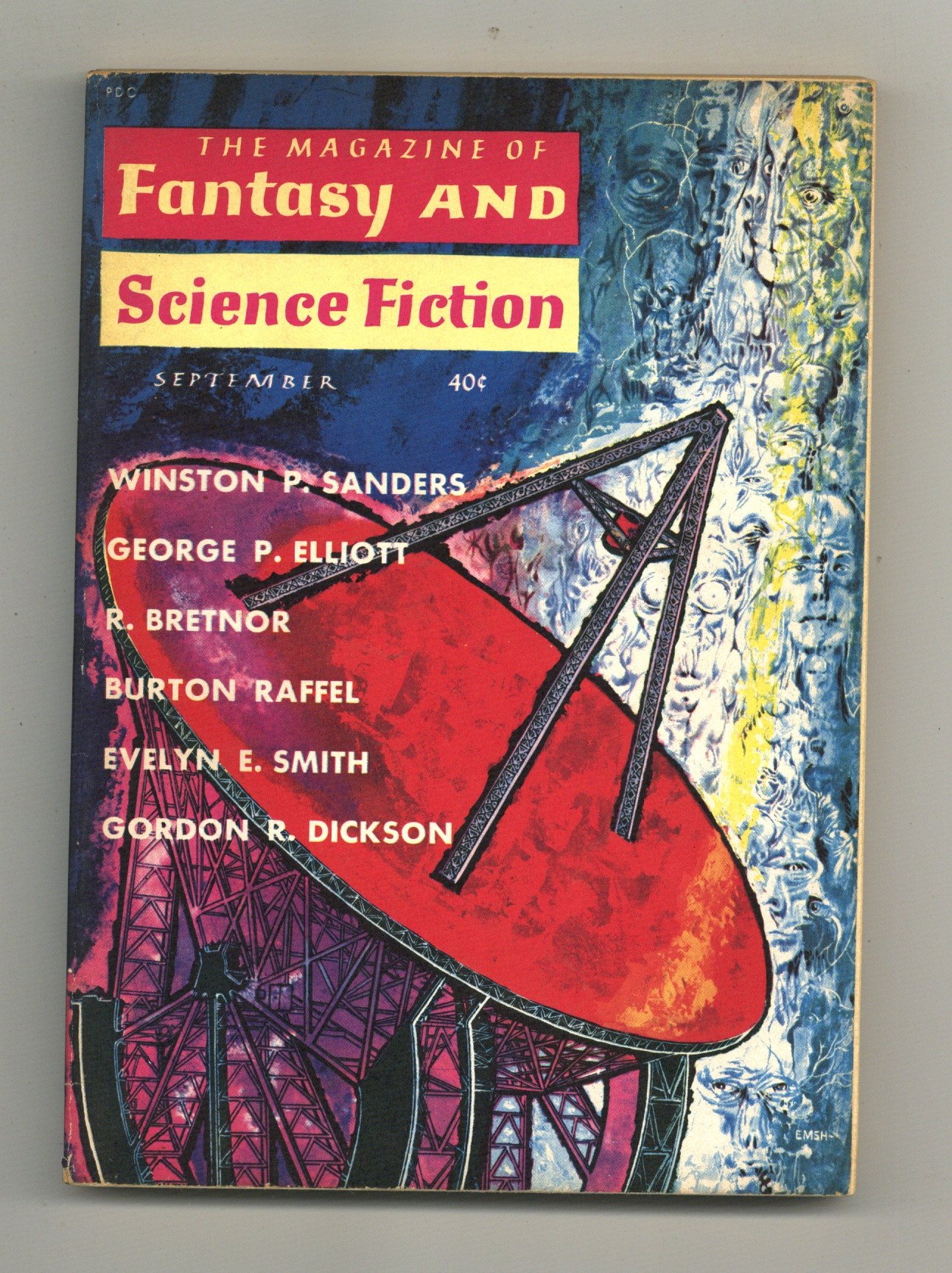 Published Sep 1960 by Mercury Publications.$10.00September 1960. Cover by Emsh. Fantasy and science fiction stories: "The Word to Space" by Winston P. Sanders, "A Day in the Suburbs" by Evelyn E. Smith, "Goodbye" by Burton Raffel, "Button, Button" by Gordon R. Dickson, "The Man on Top" by R. Bretnor, "Science: Tools of the Trade" by Issac Asimov, "Books: Walden Two" by Damon Knight, "The NRACP" by George P. Elliott, "Two in Homage" by Kit Reed, "Doctor Royker's Experiment" by Joseph Whitehill. Softcover, 5.5-in. x 7.5-in.; 128 newsprint pages, B&W. Cover price $0.40.
