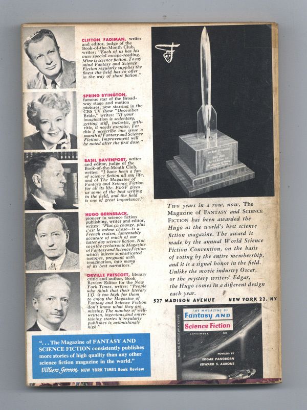 Published Feb 1960 by Mercury Publications.$2.65February 1960. Cover by Emsh. Fantasy and science fiction stories: "The First Men" by Howard Fast, "Mine Own Ways" by Richard McKenna, "Apprentice" by Robert J. Tilley, "Ferdinand Feghoot: XXIII" by Grendel Briarton, "The White Pony" by Jane Rice, "The Replacement" by Robert Murray, "Send Her Victorious" by Evelyn E. Smith, "The Price" by Algys Budrys, "Science: The Sight of Home" by Issac Asimov, "Hot Argument" by Randall Garrett, "Books: 1924" by Damon Knight, "We Are the Ceiling" by Will Worthington, "The Fellow Who Married the Maxill Girl" by Ward Moore. Softcover, 5.5-in. x 7.5-in.; 132 newsprint pages, B&W. Cover price $0.40.