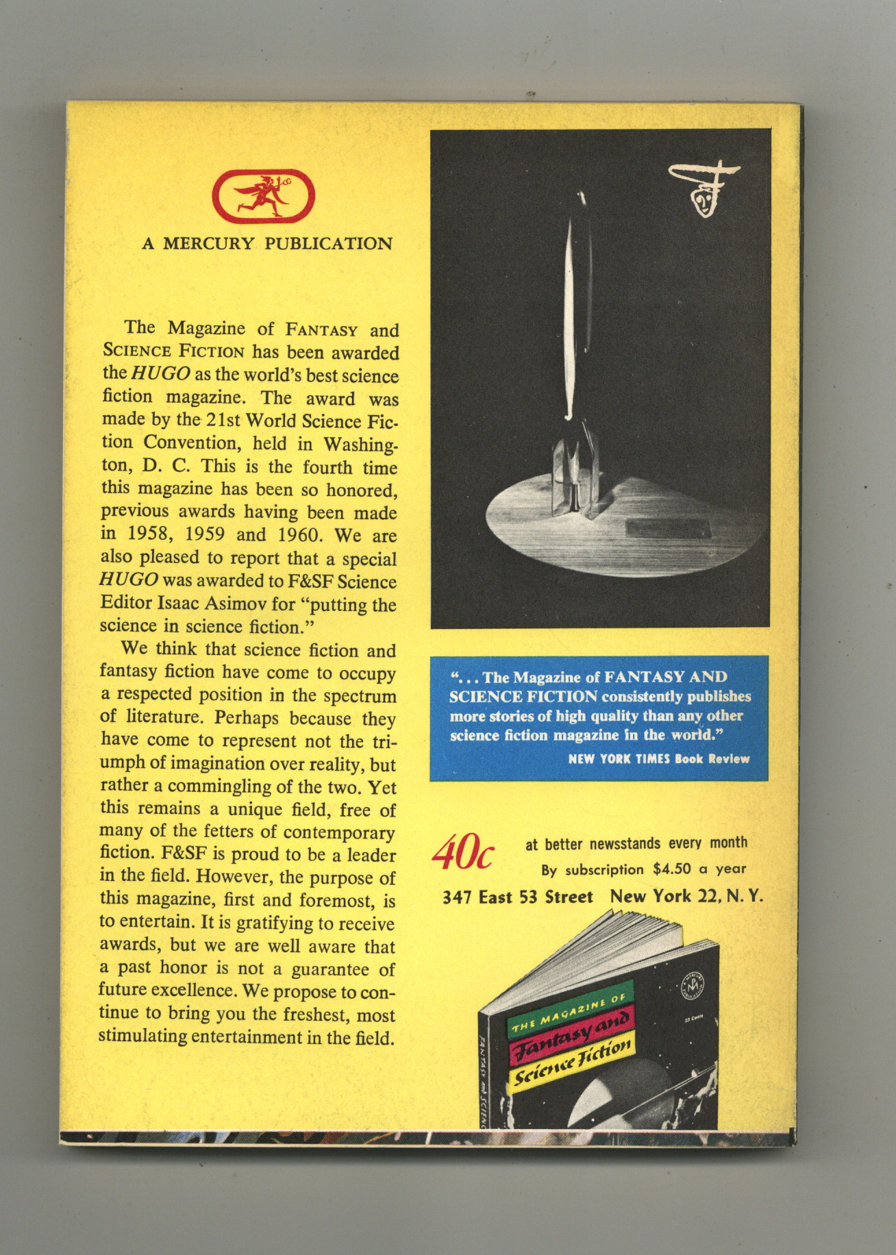 Published Jul 1964 by Mercury Publications.$16.00July 1964. Cover by Ed Emsh. Fantasy and science fiction stories: "Cantata 140" by Philip K. Dick, "The Second Philadelphia Experiment" by Robert F. Young, "Balloon Astronomy" by Theodore L. Thomas, "The Scientist and the Monster" by Gahan Wilson, "The Happy Place" by Toni Heller Lamb, Monthly essay "Books" by Avram Davidson, "The End of the Wine" by C.S. Lewis, " The Salvation of Faust" by Roger Zelazny, "All-Hallows" by Leah Bodine Drake, "Science: Nothing Counts" by Issac Asimov, "The Struldbrugg Reaction" by John Sutherland, "The Girl With the 100 Proof Eyes" by Ron Webb, "We Serve the Star of Freedom" by Jane Beauclerk. Softcover, 5-in. x 7-in., 130 newsprint pages, B&W. Cover price $0.40.