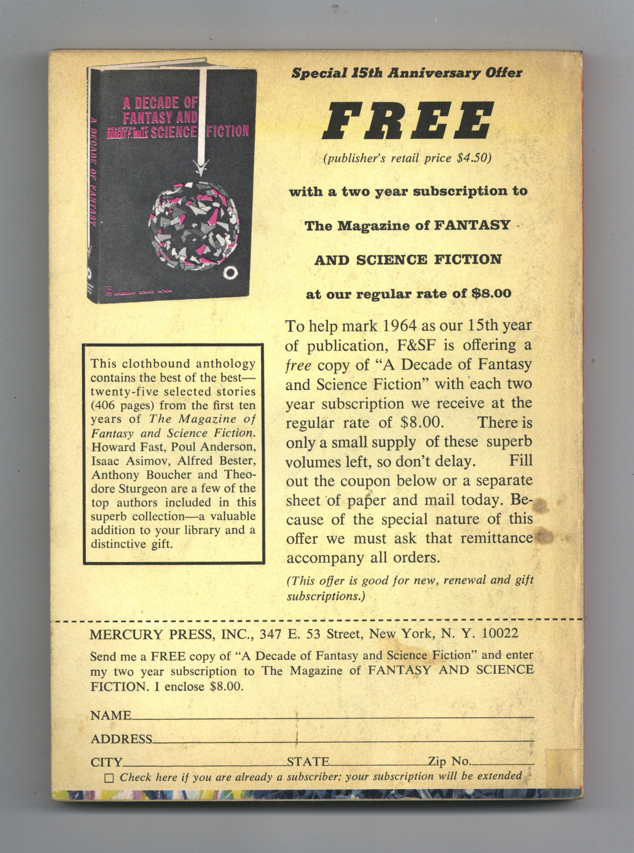 May 1964. Cover by Ed Emsh. Fantasy and science fiction stories: "The Illuminated Man" by J.G. Ballard, "Three Times Around" by Jane Roberts, "You Have To Stay Inside" by Calvin W. Demmon, "No Place Like Where" by Robert M. Green, Jr. "The Building of a Protein" by Theodore L. Thomas, "Invasion" by Christopher Corson, "A Red Heart and Blue Roses" by Mildred Clingerman, Monthly essay "Books" by Avram Davidson, "Sea Wrack" by Edward Jesby, "Mar-ti-an" by Robert Lory, "Science: Ghost Lines in the Sky" by Isaac Asimov, "Touchstone" by Terry Carr, "The New Encyclopaedist" by Stephen Becker, "Cantabile" by Jon Decles. Softcover, 5-in. x 7-in., 130 newsprint pages, B&W. Cover price $0.40.
