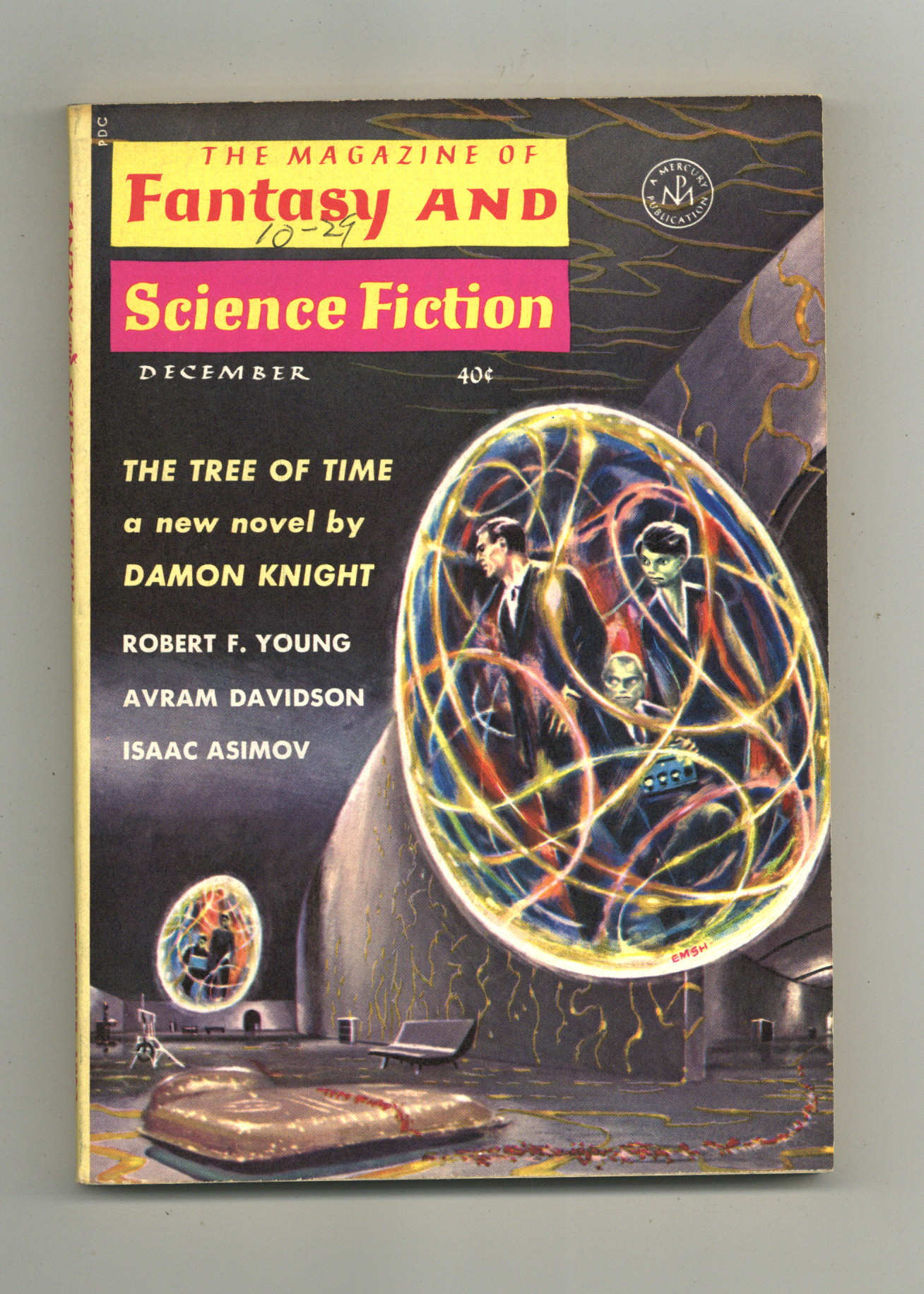 Published Dec 1963 by Mercury Publications.$34.00December 1963. Cover by Ed Emsh. Stories: "The Tree of Time" (Part 1 of 2) by Damon Knight, "Ferdinand Feghoot: LXVII" by Grendel Briarton, "The Court of Tartary" by TP Caravan, Monthly essay "Books" by Avram Davidson, "The Eternal Lovers" by Robert F. Young, "Pete Gets His Man" by J.P. Sellers, "Science: Roll Call" by Isaac Asimov, "What Strange Stars and Skies" by Avram Davidson. Softcover, 5-in. x 7-in., 130 newsprint pages, B&W. Cover price $0.40.