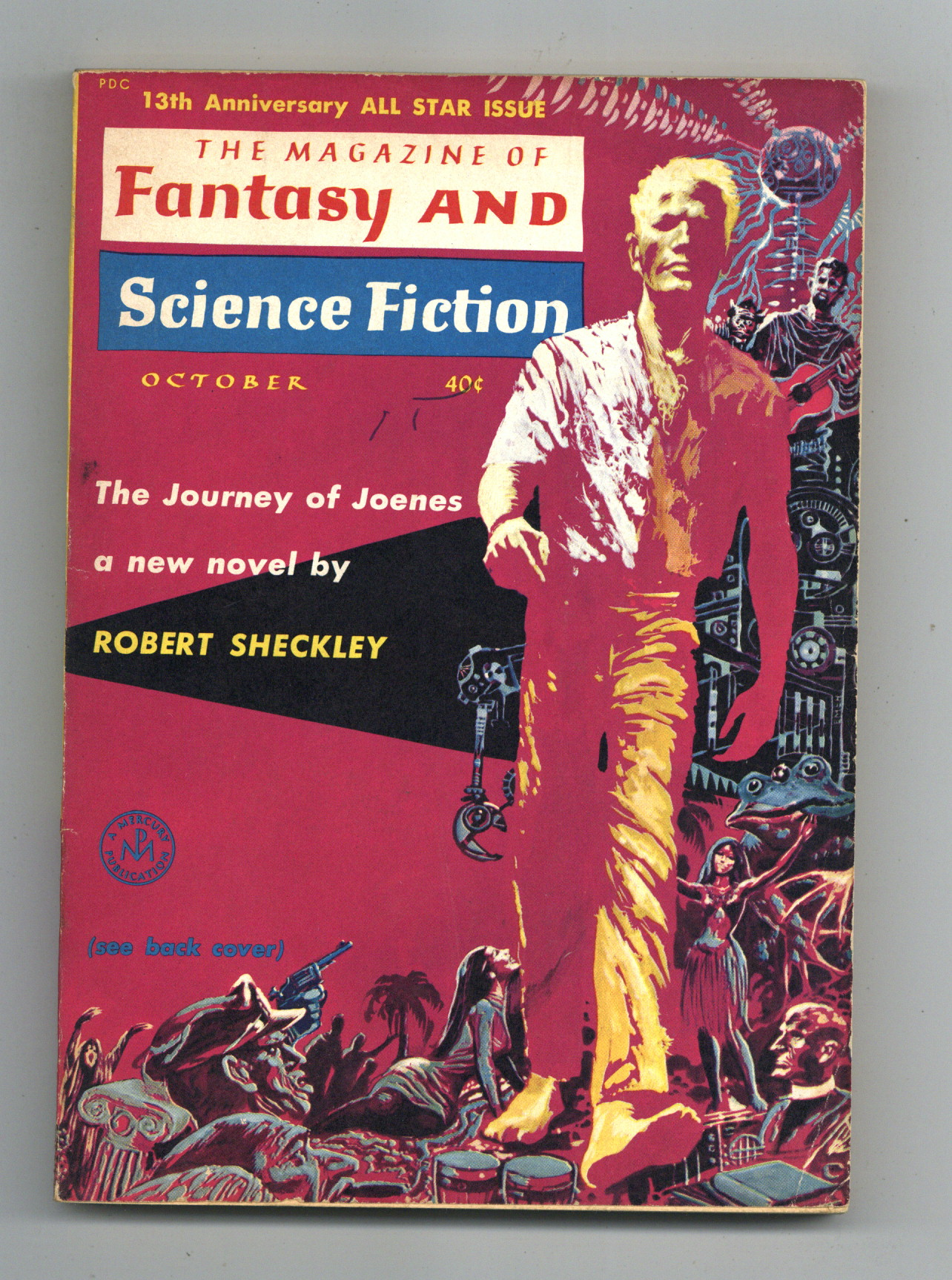 October 1962. Cover by Ed Emsh. Fantasy and science fiction stories: "A Kind of Artistry" by Brian W. Aldiss, "There Was an Old Woman Who Lived in a Shoe" by Robert F. Young, "24 Hours in a Princess's Life, With Frogs" by Don White, "Inquest in Kansas" by Hyacinthe Hill, "Measure My Love" by Mildred Clingerman, "Science: Slow Burn" by Isaac Asimov, Monthly essay "Books" by Avram Davidson, "The Unfortunate Mr. Morky" by Vance Aandahl, "Ferdinand Feghoot: LV" by Grendel Briarton, "The Journey of Joenes" (Part 1 of 2) by Robert Sheckley. Softcover, 5-in. x 7-in., 130 newsprint pages, B&W. Cover price $0.40.