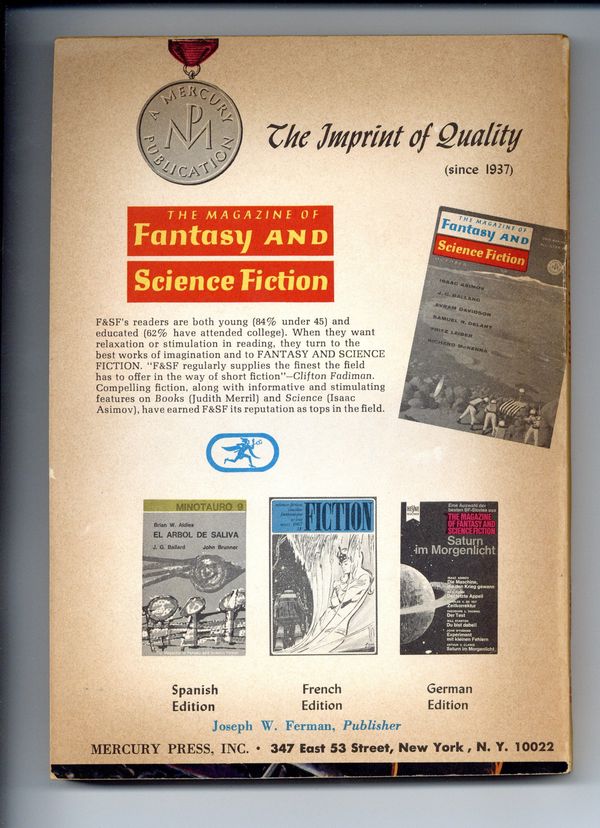 September 1968. Cover by Chesley Bonestell. Fantasy and science fiction stories: "Sos the Rope" (Conclusion) by Piers Anthony, "Ogre!" by Ed Jesby, "Butterfly Was 15" by Gilbert Thomas, "Harry's Golden Years" by Gahan Wilson, "The Evaporation of Jugby" by Stephen Barr, "A Scare in Time" by David R. Bunch, "The Moving Finger Types" by Henry Slesar, Monthly essay "Books" by Judith Merril, "Faunas" by L. Sprague De Camp, "Science: The Dying Lizards" by Isaac Asimv. Softcover, 5-in. x 7-in., 130 newsprint pages, B&W. Cover price $0.50.