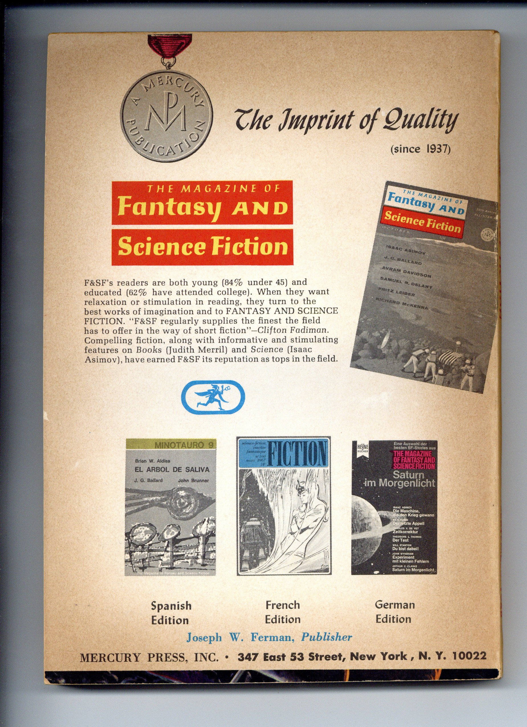 Published Sep 1968 by Mercury Publications.$2.60September 1968. Cover by Chesley Bonestell. Fantasy and science fiction stories: "Sos the Rope" (Conclusion) by Piers Anthony, "Ogre!" by Ed Jesby, "Butterfly Was 15" by Gilbert Thomas, "Harry's Golden Years" by Gahan Wilson, "The Evaporation of Jugby" by Stephen Barr, "A Scare in Time" by David R. Bunch, "The Moving Finger Types" by Henry Slesar, Monthly essay "Books" by Judith Merril, "Faunas" by L. Sprague De Camp, "Science: The Dying Lizards" by Isaac Asimv. Softcover, 5-in. x 7-in., 130 newsprint pages, B&W. Cover price $0.50.