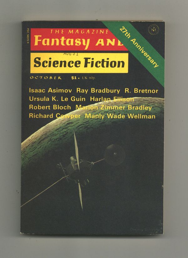 Published Oct 1976 by Mercury Publications.$90.00October 1976. Cover by Chesley Bonestell. Fantasy and science fiction stories: "The Ladies of Beetlegoose Nine" by R. Bretnor, "The Hertford Manuscript" by Richard Cowper, "Hero's Moon" by Marion Zimmer Bradley, "From A to Z, in the Chocolate Alphabet" by Harlan Ellison, "The Barrow" by Ursula K. Le Guin, "A Case of the Stubborns" by Robert Bloch, "Where the Woodbine Twineth" by Manly Wade Wellman and "Out of Dickinson By Poe" by Ray Bradbury. Film review for "Watch Out For Falling Men" by Baird Searles. Monthly science article "Quasar, Quasar, Burning Bright" by Isaac Asimov. 5-in. x 7-in., black and white; 162 pages. Cover price $1.00.