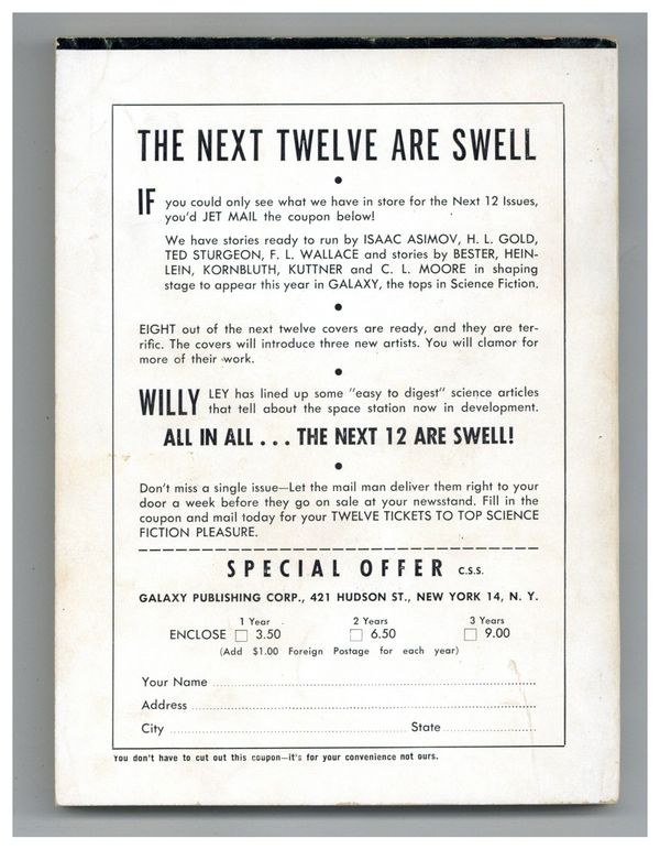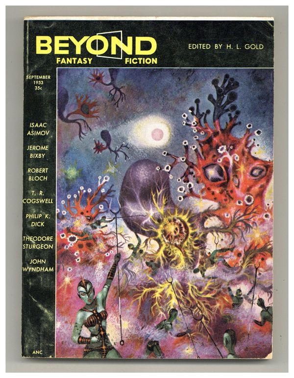Published Aug 1953 by Galaxy Publishing.$17.50September 1953. Cover by Richard Powers. Fantasy stories: "The Wall Around the World" by Theodore R. Cogswell, "The Dream Makers" by Robert Bloch, "The King of the Elves" by Philip K. Dick, "Wire-Haired Radical" by Joseph Shallit, "Can Such Beauty Be?" by Jerome Bixby, "Talent" by Theodore Sturgeon, "A Little Pile" by M. C. Pease, "How Do I Do?" by John Wyndham, "And Not Quite Human" by Joe L. Hensley, "Kid Stuff" by Isaac Asimov and "The Goddess On the Street Corner" by Margaret St. Clair. 160 Pages, B&W. Cover price $0.35.