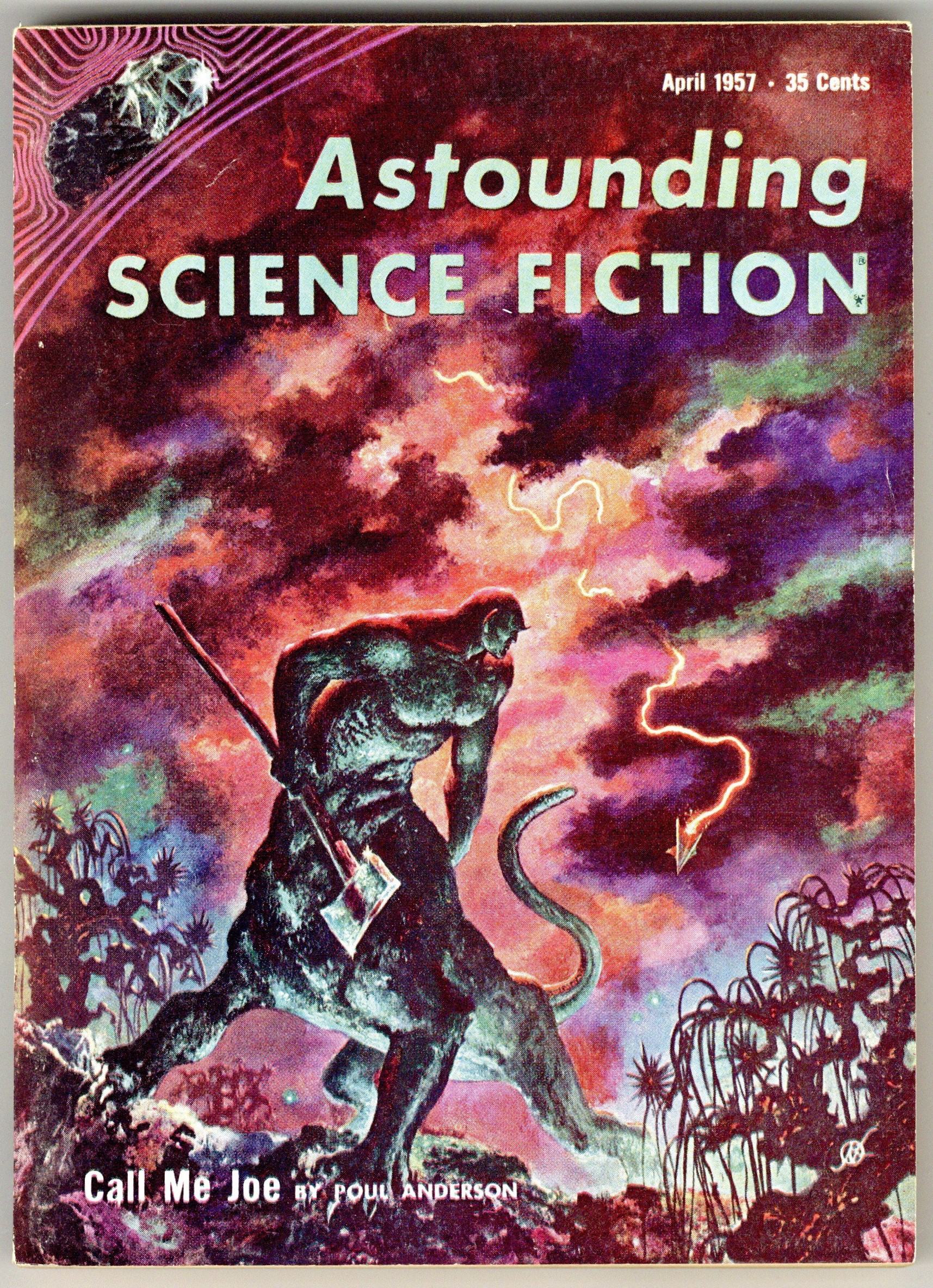 Published Apr 1957 by Street & Smith.$4.00April 1957. Cover by Freas. Stories: "Call Me Joe" by Poul Anderson, "Chain Reaction" by John A. Sentry, "Torch" by Christopher Anvil, "The Mile-Long Spaceship" by Kate Wilhelm, "The Lost Vegan" by E. J. McKenzie, Jr. and "The Dawning Light" (Part 2 of 3) by Robert Randall. Article "The Unblind Workings of Chance" by Isaac Asimov. Softcover, 5.5-in. x 7.75-in.; 162 newsprint pages, B&W. Cover price $0.35.