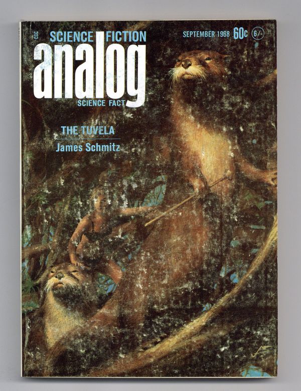 Published Sep 1968 by Dell Magazines.$5.20September 1968. Cover by John Schoenherr. Stories: "The Tuvela"(Part 1) by James Schmitz, "Hi Diddle Diddle" by Peter E. Abresch, "The Powers of Observation" by Harry Harrison, "A Flash of Darkness" by Stanley Schmidt, and "Parasike" by Michael Chandler. Science Fact article: "Steamer Time?" Wallace West. Softcover, 5.5-in. x 7.5-in.; 178 newsprint pages, B&W. Cover price $0.60.