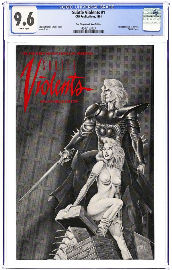 1991 San Diego Edition Nude Sketch Cover by Linsner. This edition is limited to 1,000 copies and is signed and numbered by the creators on the inside front cover. "Rhyder" by Joseph Michael Linsner, "Ahryssia 1 Out of the Black" by Joseph M. Monks, "The New Order" by Kevin J. Taylor, and an interview with Tim Conrad. 48 pgs. B&W with color covers by Linsner. Mature readers; sexual themes.