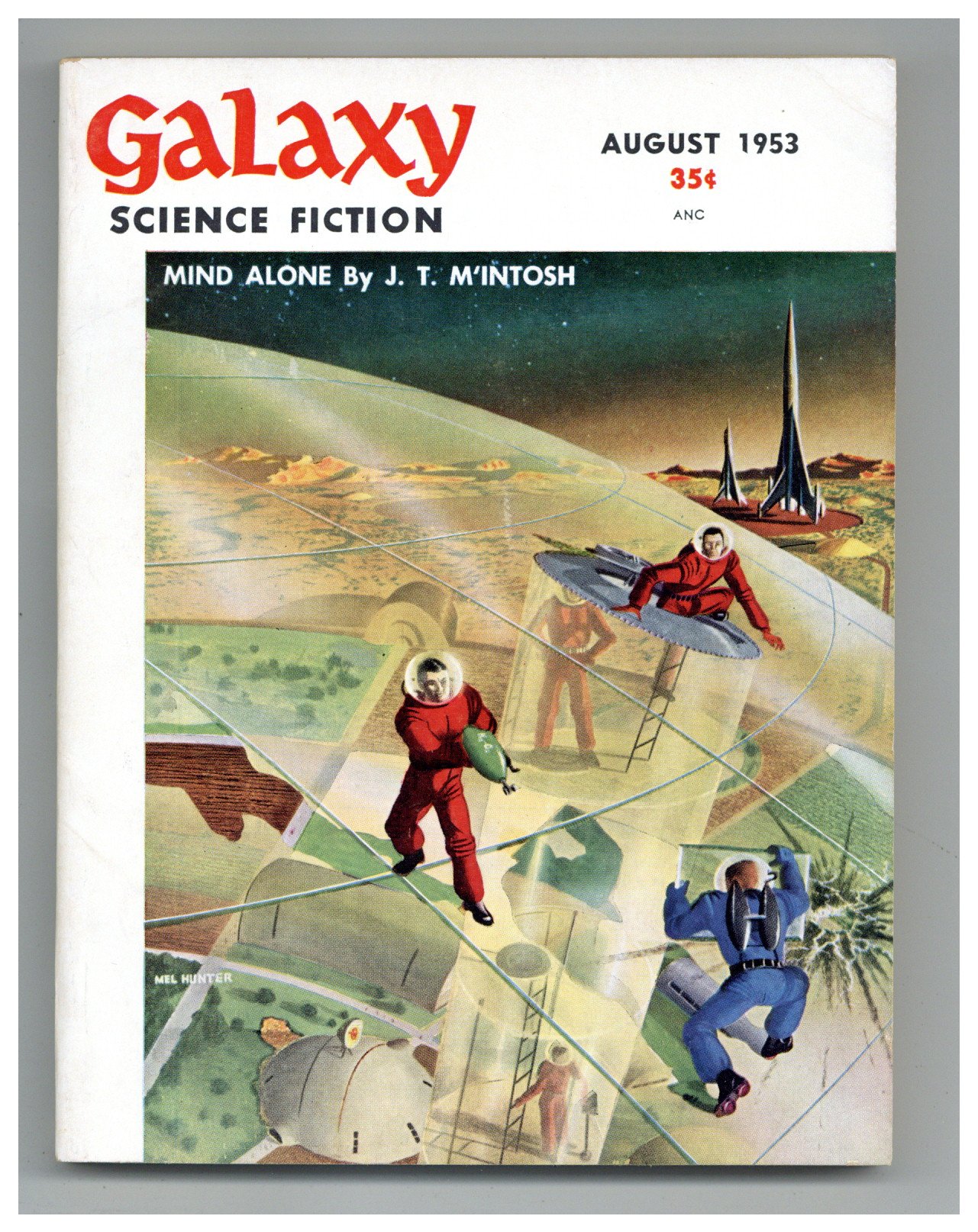 Published Aug 1953 by Galaxy Publications.$13.75August 1953. Cover by Mel Hunter. Stories: "Mind Alone" by J. T. M'Intosh, "Diplomatic Immunity" by Robert Sheckley, "Stamped Caution!" by Raymond Z. Gallun, "We're Civilized" by Mark Clifton and Alex Apostolides, "The Trap" by Betsy Curtis, and "Minimum Sentence" by Theodore R. Cogswell. 5.25-in. x 7.5-in.; 160 Pages, B&W. Cover price $0.35.
