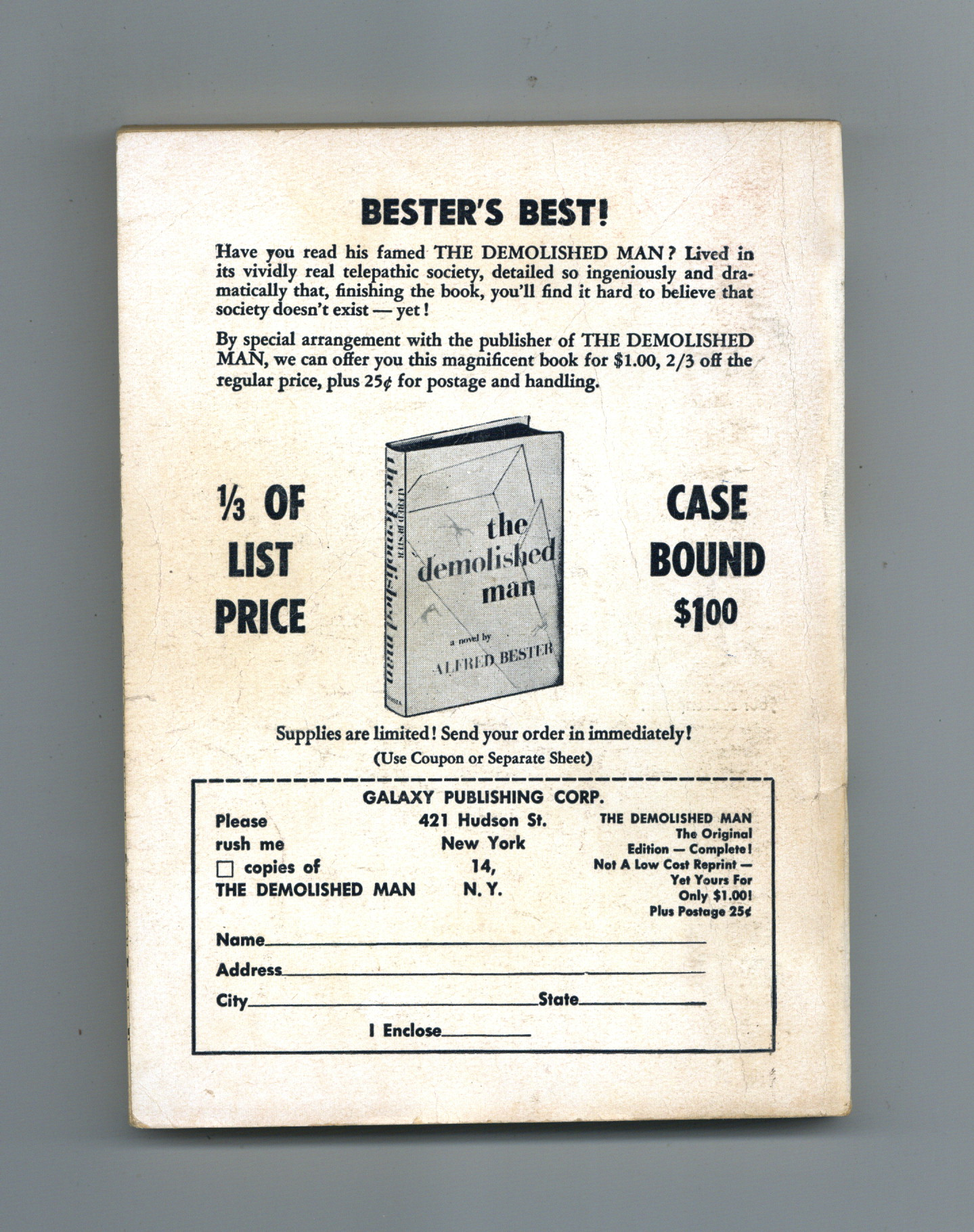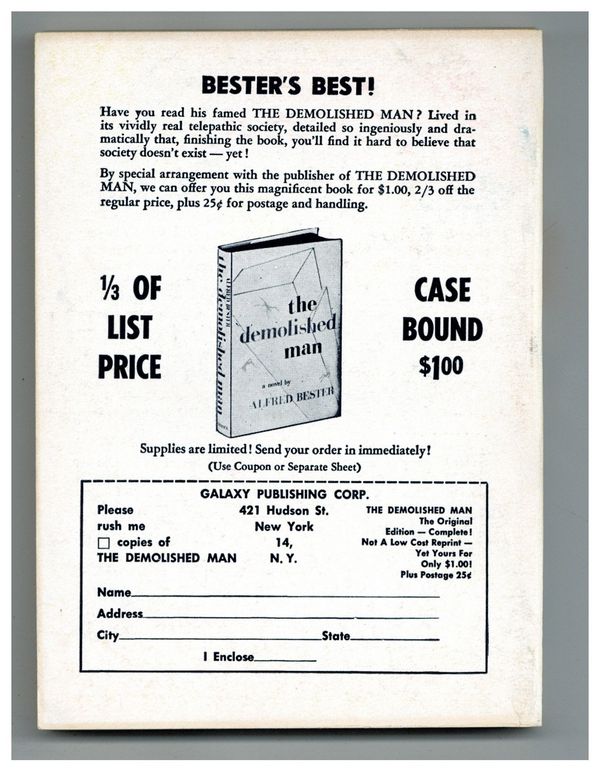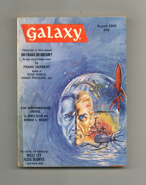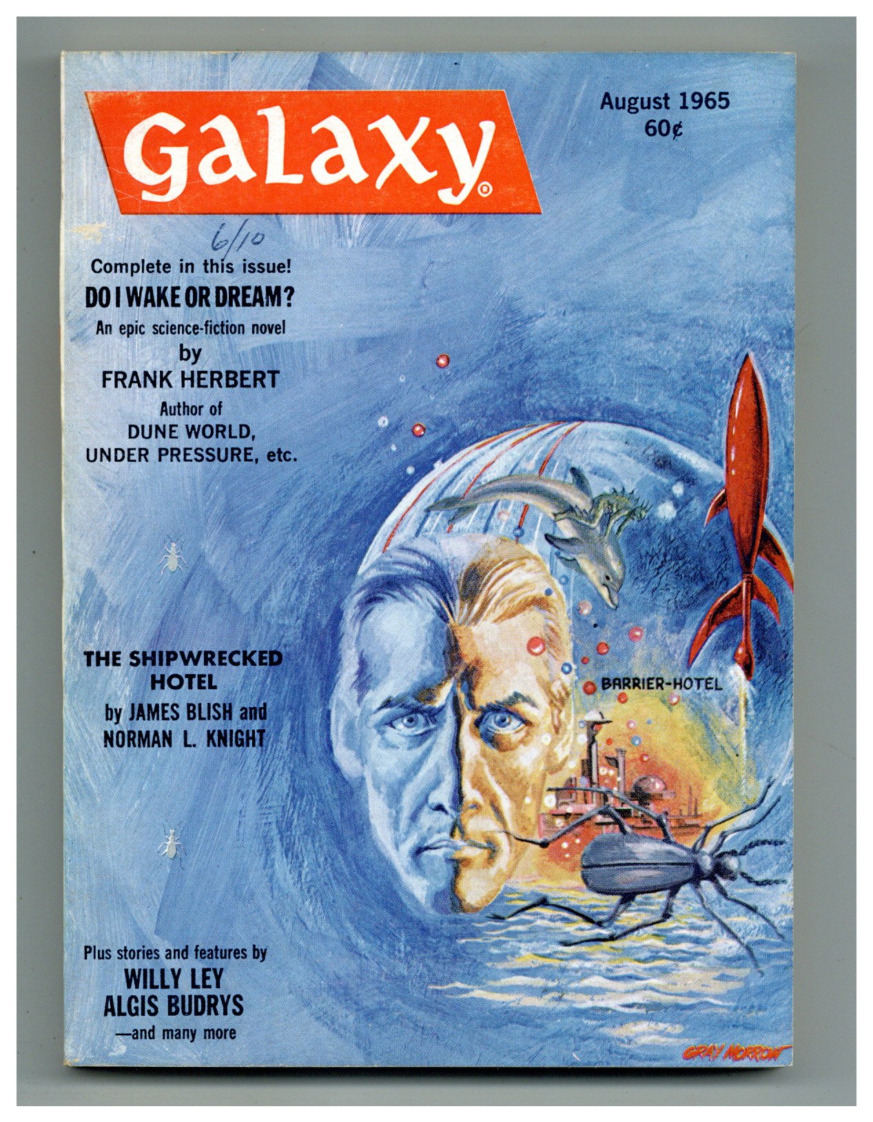 Published Aug 1965 by Galaxy Publications.$2.65Galaxy Science Fiction. August 1965. Cover by Morrow. Stories: "Do I Wake or Dream?" by Frank Herbert, "The Shipwrecked Hotel" by James Blish and Norman L. Knight, "Peeping Tommy" by Robert F. Young, and "Please State My Business" by Michael Kurland. 5.25-in. x 7.5-in.; 194 Pages, B&W. Cover price $0.60.