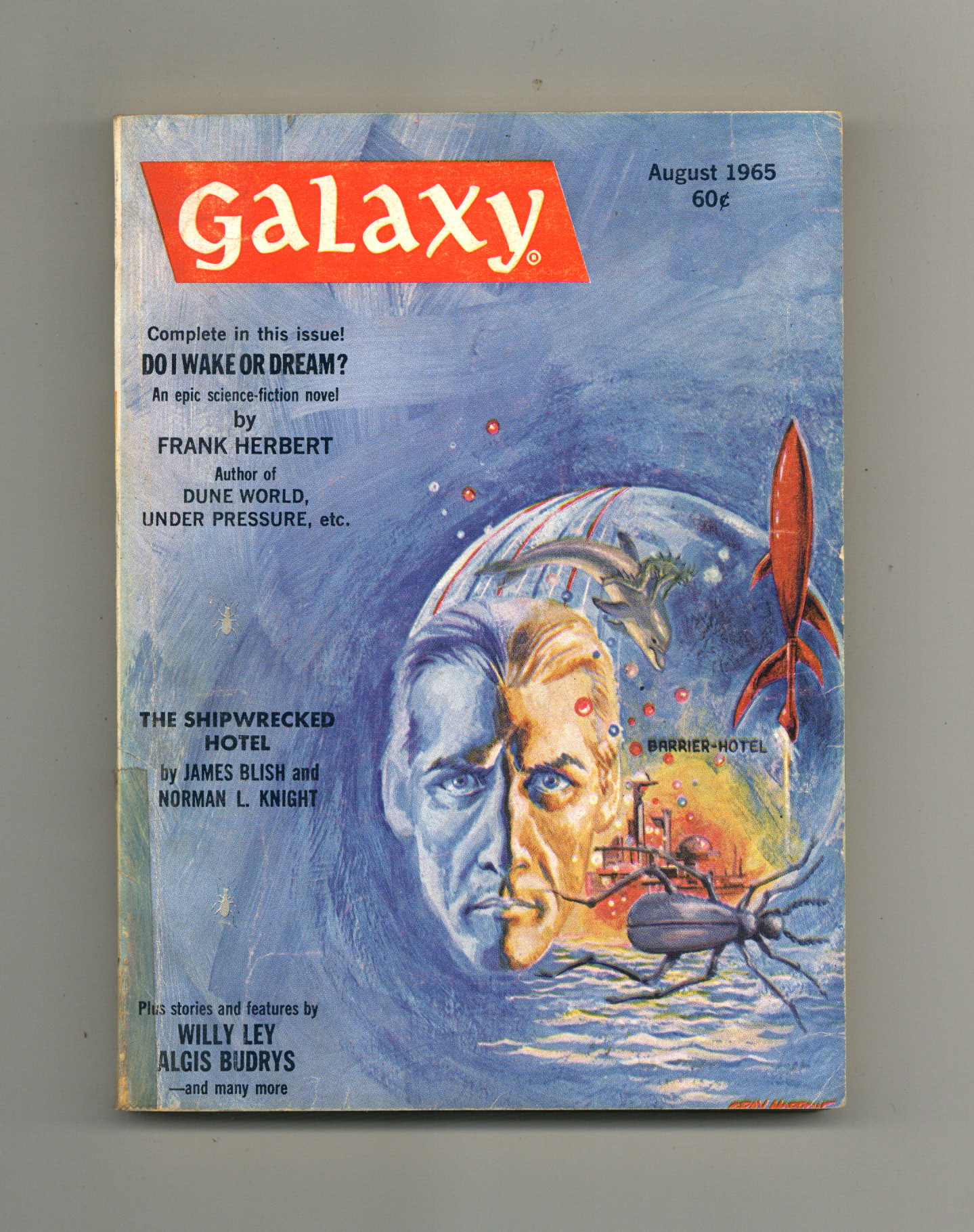 Galaxy Science Fiction. August 1965. Cover by Morrow. Stories: "Do I Wake or Dream?" by Frank Herbert, "The Shipwrecked Hotel" by James Blish and Norman L. Knight, "Peeping Tommy" by Robert F. Young, and "Please State My Business" by Michael Kurland. 5.25-in. x 7.5-in.; 194 Pages, B&W. Cover price $0.60.