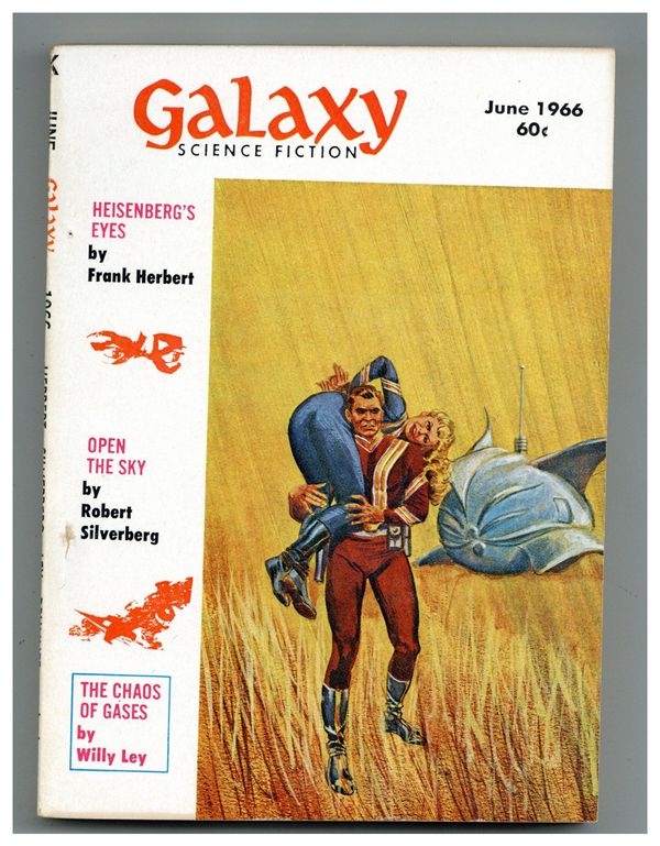Published Jun 1966 by Galaxy Publications.$5.00June 1966. Cover by Morrow. Stories: "The Eskimo Invasion" by Hayden Howard, "Open Sky" by Robert Silverberg, "Heisenberg's Eyes"(Part 1) by Frank Herbert, "Priceless Possession" by Arthur Porges, and "When I Was Miss Dow" by Sonya Dorman. Non-Fact Articles: "Galactic Consumer Report No. 2: Automatic Twin-Tube Wishing Machine" by John Brunner. 5.25-in. x 7.5-in.; 194 Pages, B&W. Cover price $0.60.