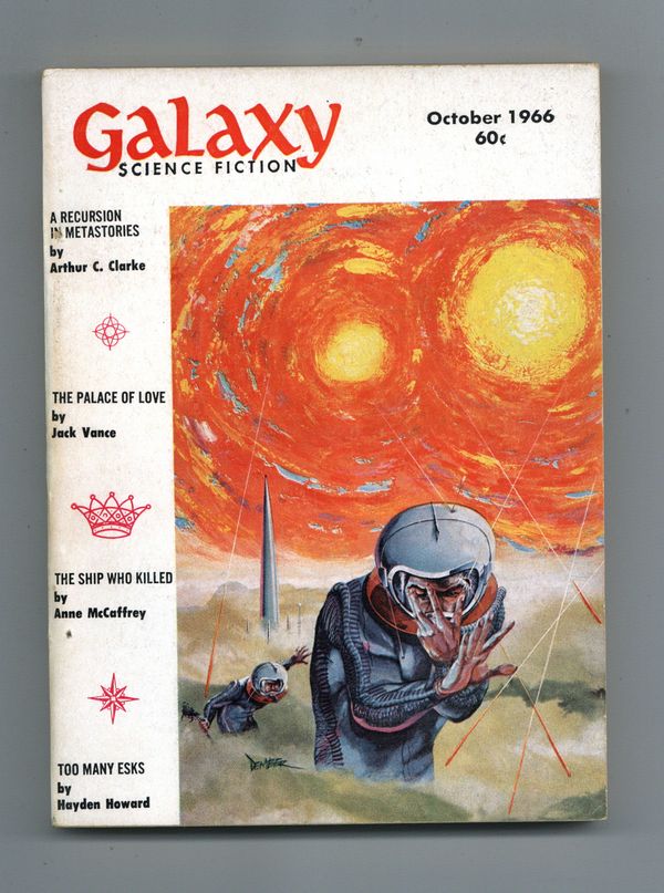 Published Oct 1966 by Galaxy Publications.$10.50October 1966. Cover by Dember. Stories: "How the Heroes Die" by Larry Niven, "The Ship Who Killed" by Anne McCaffrey, "Too Many Esks" by Hayden Howard, "Planet of Fakers" by J. T. McIntosh, "The Palace of Love"(Part 1) by Jack Vance, and "A Recursion in Metastories" by Arthur C. Clarke. 5.25-in. x 7.5-in.; 194 Pages, B&W. Cover price $0.60.