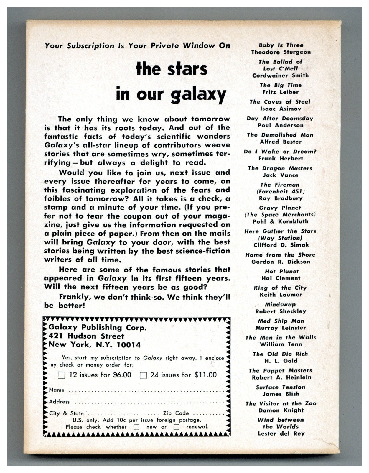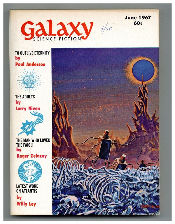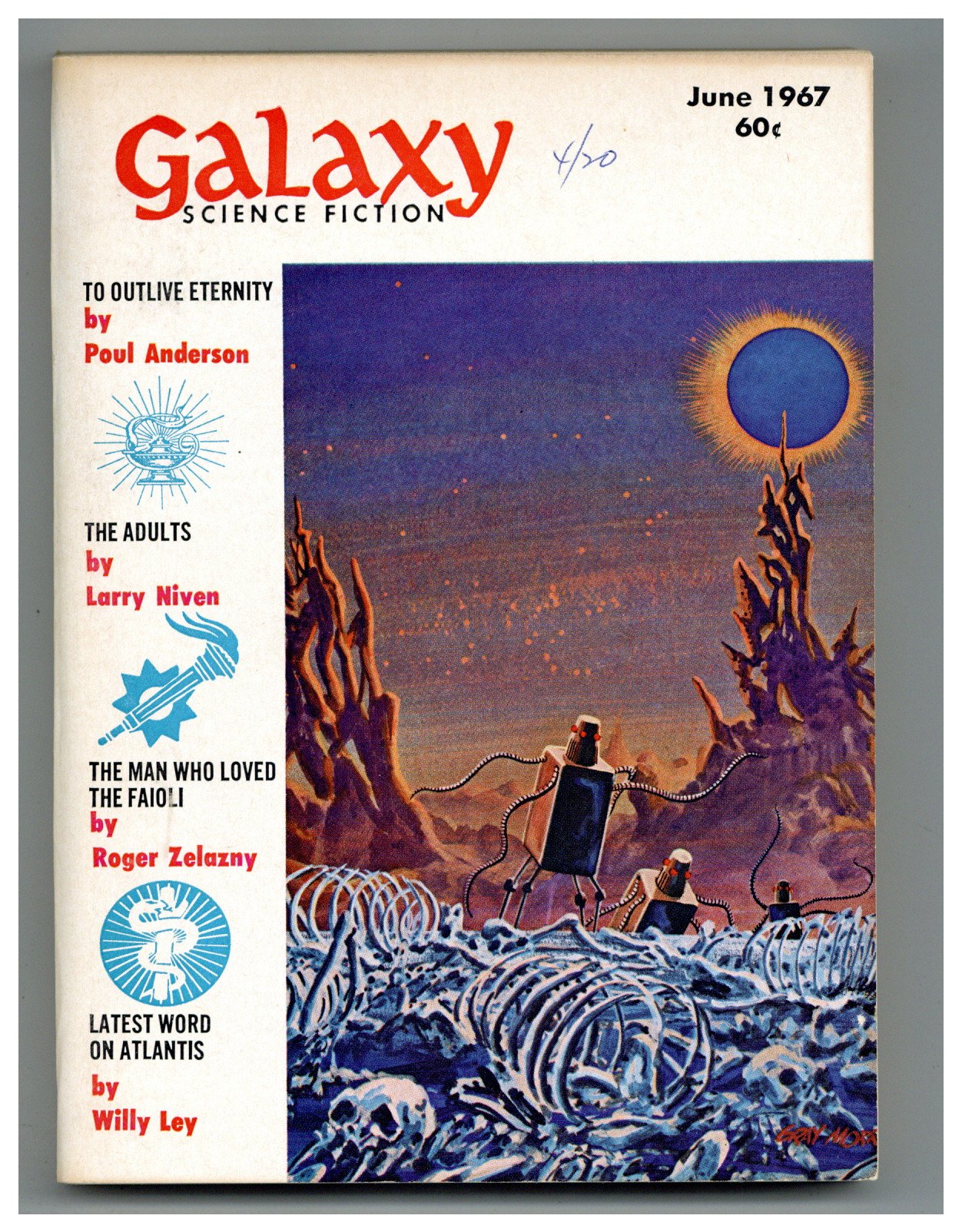 Published Jun 1967 by Galaxy Publications.$8.49June 1967. Cover by Morrow. Stories: "Spare That Tree" by C. C. MacApp, "The Adults" by Larry Niven, "To Outlive Eternity"(Part 1) by Poul Anderson, "Mirror of Ice" by Gary Wright, "Polity and Custom of the Camiroi" by R. A. Lafferty, "The Man Who Loved the Faioli" by Roger Zelazny, "Howling Day" by Jim Harmon, and "Alien's Bequest" by Charles V. DeVet. 5.25-in. x 7.5-in.; 194 Pages, B&W. Cover price $0.60.