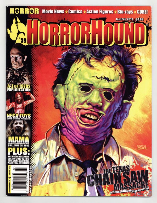 Published Feb 2013 by HorrorHound Enterprises.$12.00Horror movie news, comics, action figures and blu-rays. In this issue: The Texas Chainsaw Massacre attacks cinemas in 2013 thanks to a new 3-D feature film, and HorrorHound celebrates with a special exploitation-heavy issue headlined by a TCM retrospective looking back at nearly 40 years of "the saw"! Plus: NECA Toys - Carrie, Gremlins and Prometheus; Mama - an exclusive interview with Guillermo del Toro; The Profane Exhibit; Best of 2012 Voting; Jamie Lee Curtis; Warriors; and more. Mature Readers. Cover price $6.99.