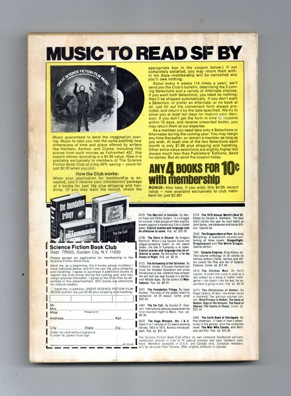 February 1979. Cover by Dean Ellis. Stories: "Titan"(Part 2) by John Varley, "Triad" by Sam Nicholson, "Songs of a Sentient Flute" by Frank Herbert, "Last Hunt" by Eric Vinicoff and Marcia Martin, "Letter to Ed" by Edmundo Hamiltowne, and "The Odds Man" by Gary Alan Ruse. Science Fact article: "Today's Computers, Intelligent Machines and our Future" by Hans Moravec. State of the Art article: "A Computer that Writes Science Fiction" by Paul J. Nahin. Softcover, 5.25-in. x 7.5-in.; 178 newsprint pages, B&W. Cover price $1.25.