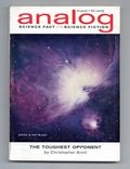 August 1962. Stories: "Border, Breed Nor Birth"(Conclusion) by Mack Reynolds, "The Toughest Opponent" by Christopher Anvil, "The Bramble Bush" by Randall Garrett, "Watch the Sky" by James H. Schmitz, Science Fact articles: "The Big Job of Moving Little Things" by John W. Campbell, and "The Color of Space". Softcover, 5.5-in. x 7.5-in.; 178 newsprint pages, B&W. Cover price $0.50.