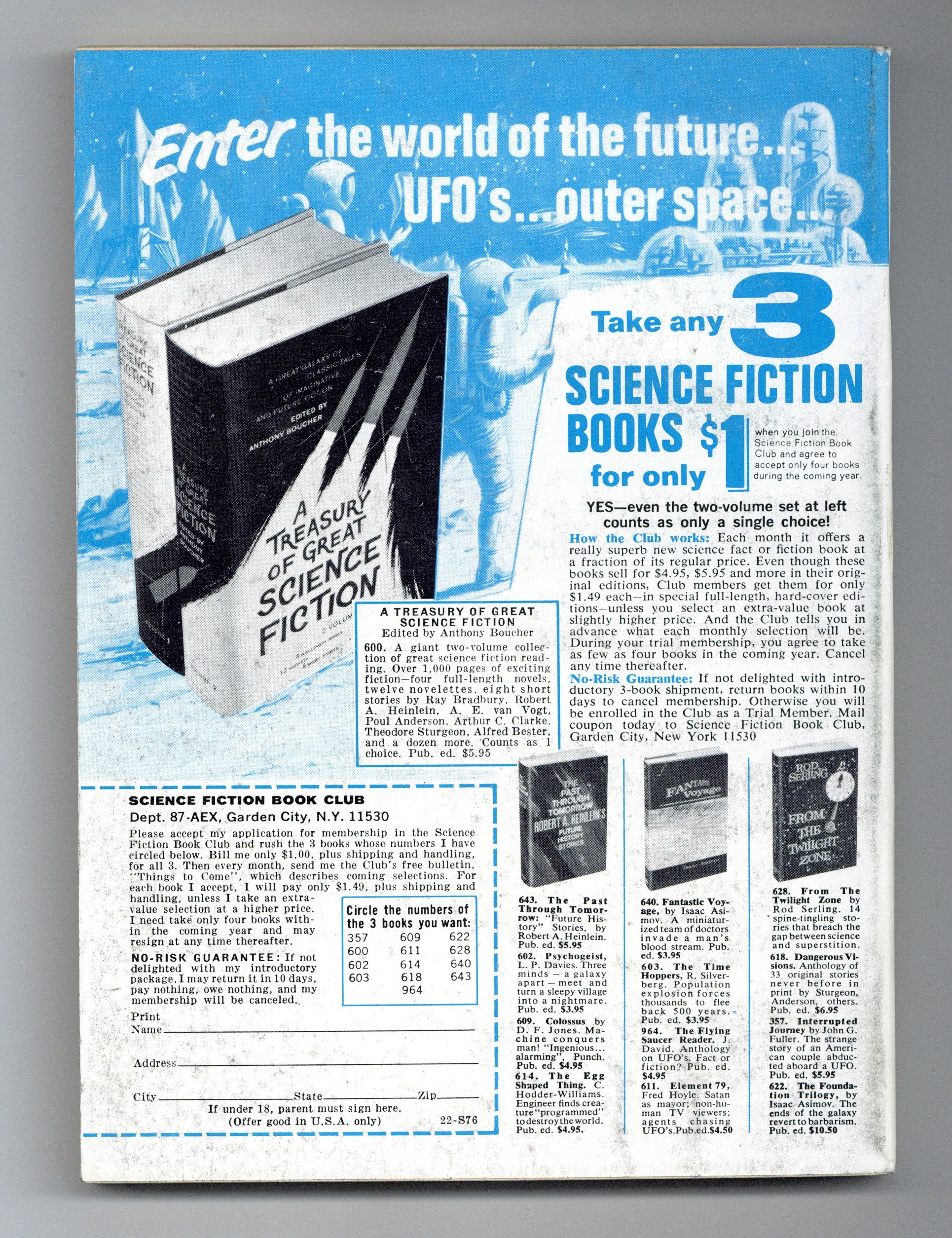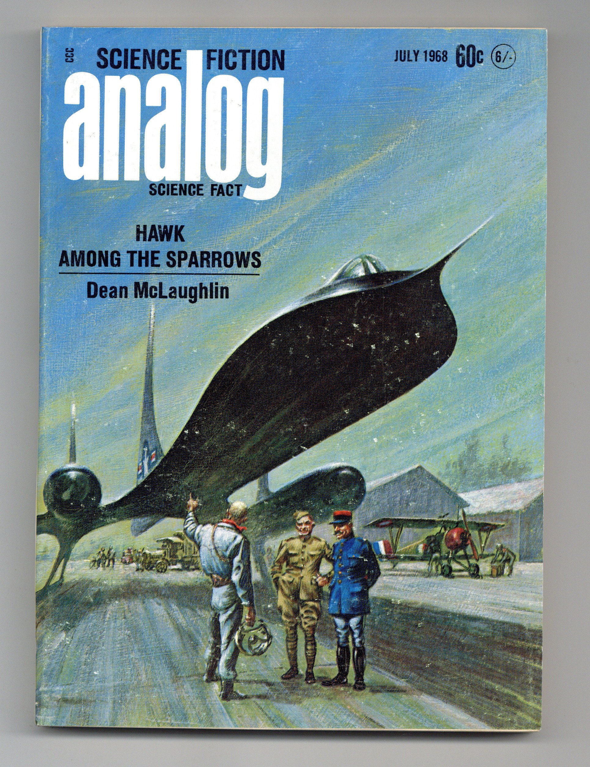 July 1968. Cover by Kelly Freas. Stories: "Satan's World"(Part 3) by Poul Anderson, "Hawk Among the Sparrows" by Dean McLaughlin, "Null Zone" by Joe Poyer, "To Sleep, Perchance to Dream..." by W. C. Francis, and "Winkin, Blinkin and πR^2" by R. C. FitzPatrick. Science Fact article: "Icarus and Einstein" by Robert S. Richardson. Softcover, 5.5-in. x 7.5-in.; 178 newsprint pages, B&W. Cover price $0.60.