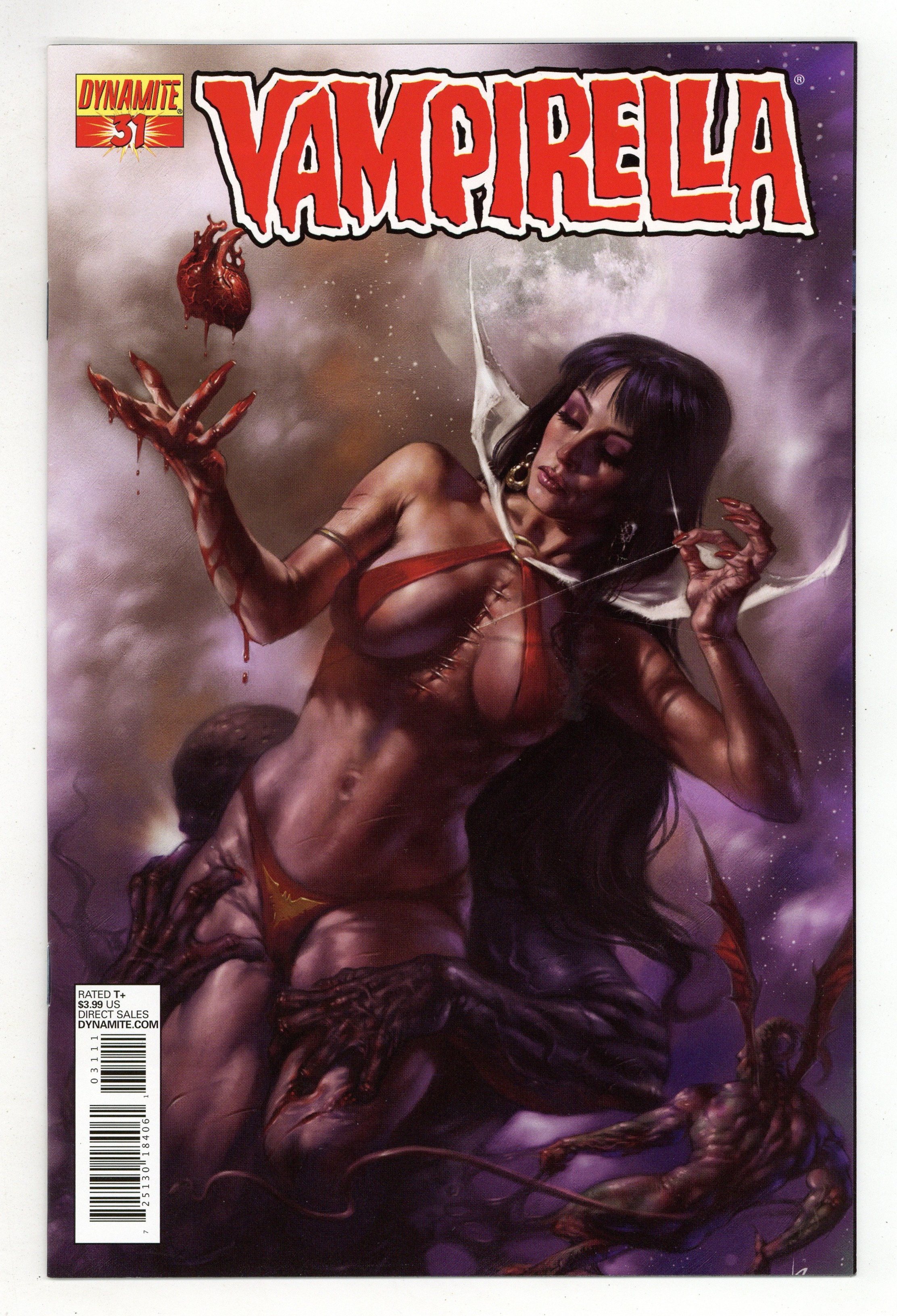 Tags: VampiresPublished Aug 2013 by Dynamite Entertainment.$40.00Cover by Lucio Parrilla. Set the Controls for the Heart of the Sun: Part 3 of 3 - (W) Brandon Jerwa. (A) Patrick Berkenkotter. It's been said that you should never know your own future...but what if you do? Decisions will be made, fates will be met, and a kingdom will rise! But will Vampirella have the strength to bear the painful price of victory? Cover price $3.99.