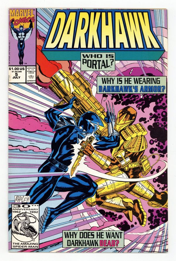 1992 reprint available only through JC Penney catalog. Cover pencils by Mike Manley. Fury From Beyond, script by Danny Fingeroth, pencils by Mike Manley, inks by Ricardo Villagran; Darkhawk destroys his room after seeing his face in the mirror; A hitman is after Chris' mother. St. Johnny says he knew the last Darkhawk and that the face under the mask is the face we all deserve; Chris is shot in the leg as he foils hit on his mother; Portal, who looks similar to Darkhawk with the amulet ripped out of the chest, attacks him after he changes to Darkhawk; Guards from the Vault watch Portal in the hospital. 36 pgs. $1.00. NOTE: Low Print run. Can be identified by 30th Anniversary Spider-Man in UPC box and having X-Men trading card ad on back cover. Cover price $1.00.