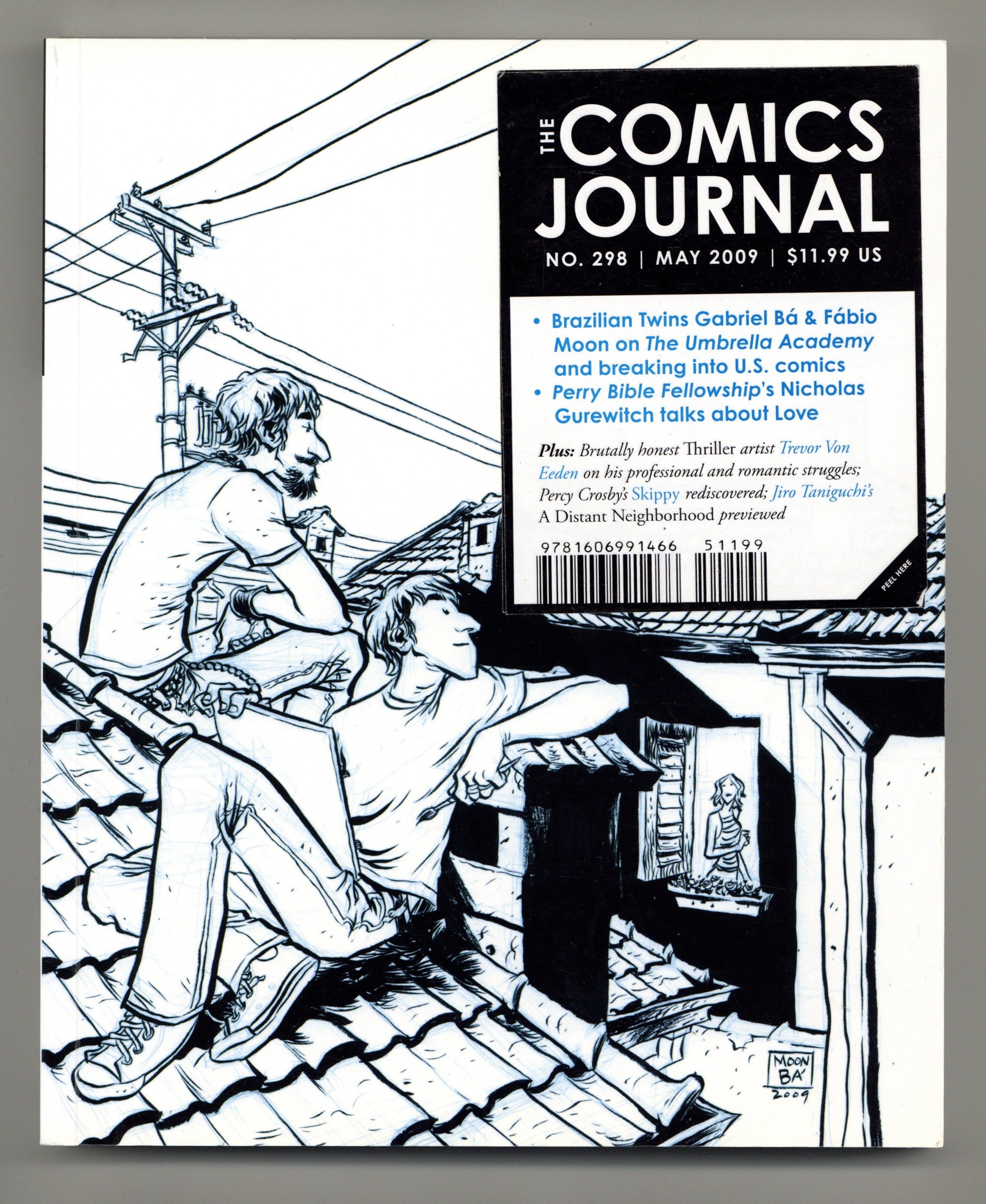 Published May 2009 by Fantagraphics.$12.00NOTE: Manufacturer's non-permanent "peel-off" retail sticker on front cover may or may not still be present. The Magazine of Comics News and Criticism. This issue, the multiple Eisner Award-winning Brazilian twins Gabriel Bá and Fábio Moon tell us about working together on graphic novels such as DeTales and Ursula and the anthology 5, as well as collaborating with My Chemical Romance's Gerard Way on Umbrella Academy, Joss Whedon on Sugarshock and Matt Fraction on Casanova. Plus: Perry Bible Fellowship creator Nicholas Gurewitch gives us the scoop on his BBC television pilot based on the strip, why he semi-retired the comic after its phenomenal success on the Web and in alt-weeklies and collections, and what it's like to achieve that level of fame by the age of 25. Also: Brutally honest Thriller artist Trevor Von Eeden on his professional and romantic struggles; Percy Crosby's Skippy rediscovered; Jiro Taniguchi's A Distant Neighborhood previewed; and Noah Van Sciver conducts a cartoon interview with Peter Bagge. Plus: reviews, comics, letters and news. Cover by Fábio Moon & Gabriel Bá. 208 pages, PC/PB&W. Cover price $11.99.