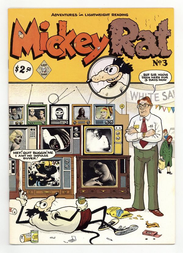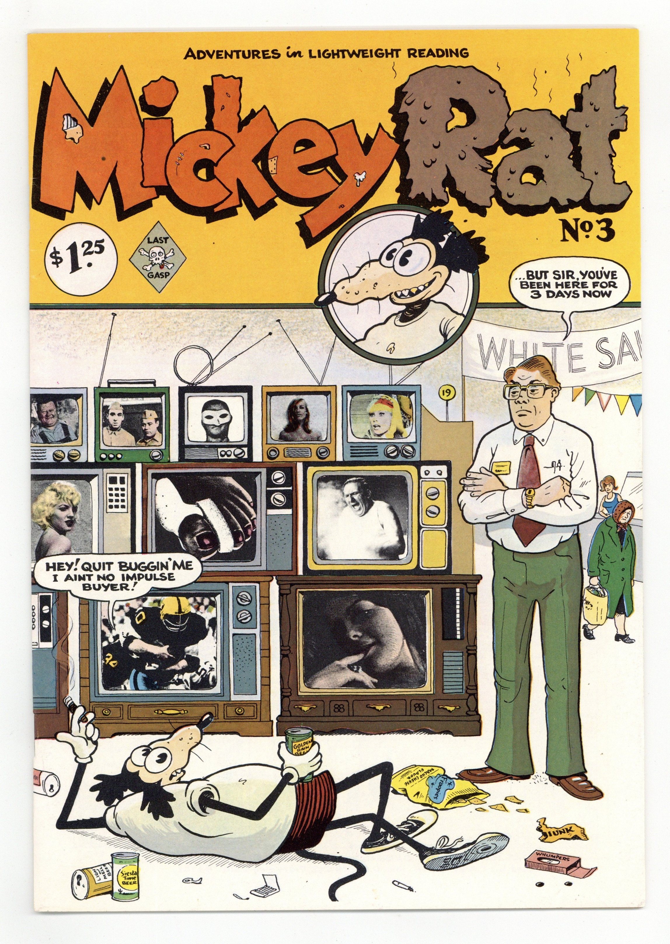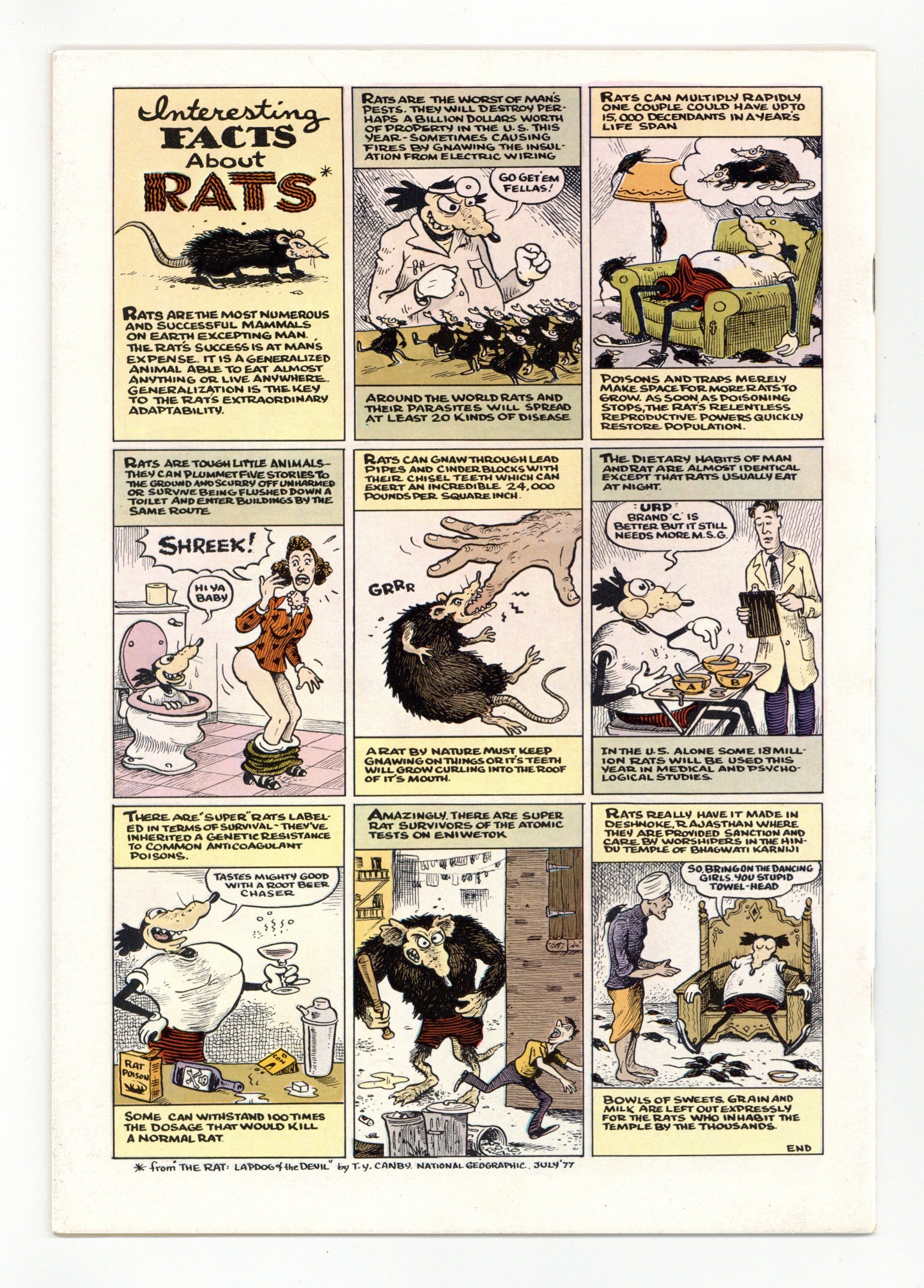 The misanthropic rodent returns after eight years, now published by Last Gasp. The Rat visits a psych ward and Chinatown, while Dizzy Ratstein has his own misadventures. Mature readers. Black and white; 32 pages. Cover by Armstrong. Cover price $1.25.