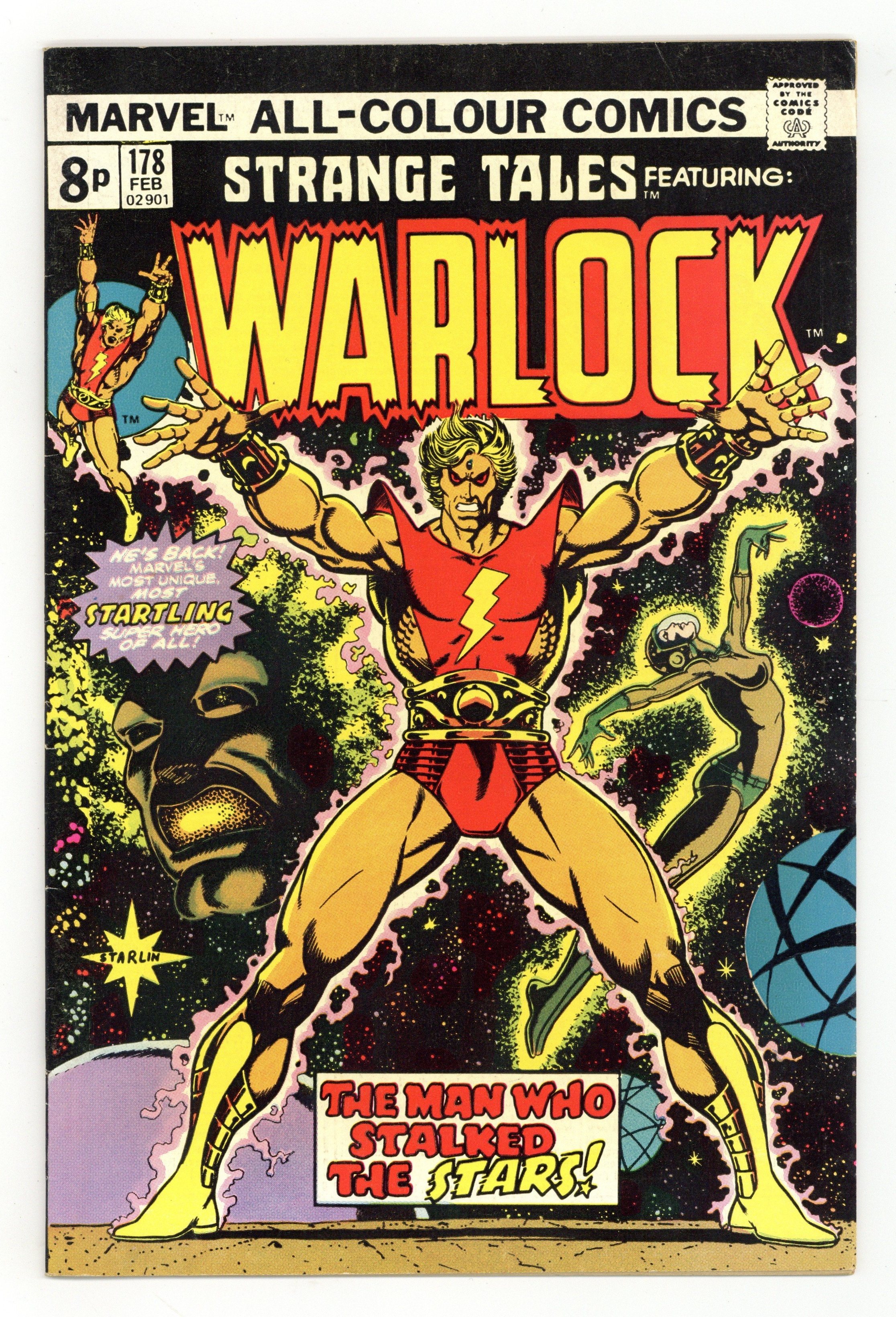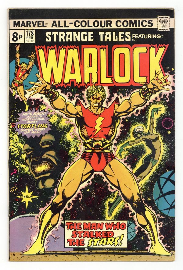 UK edition. Identical to US edition, but has 8p cover price. Cover art by Jim Starlin. Warlock begins in this title in "Who Is Adam Warlock?", script and art by Jim Starlin; Sphinxor retells the Origin of Warlock, his encounters with Thor and the High Evolutionary, the Creation of Counter-Earth and Warlock's Battle against the Man-Beast; First appearance of the Magus; Cameo appearances by the Hulk. The story continues from Incredible Hulk 178. 36 pgs., full color.