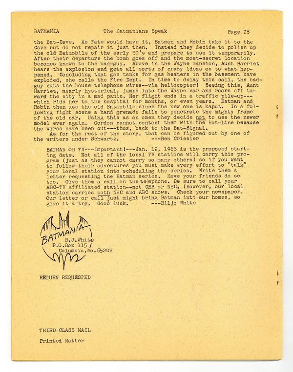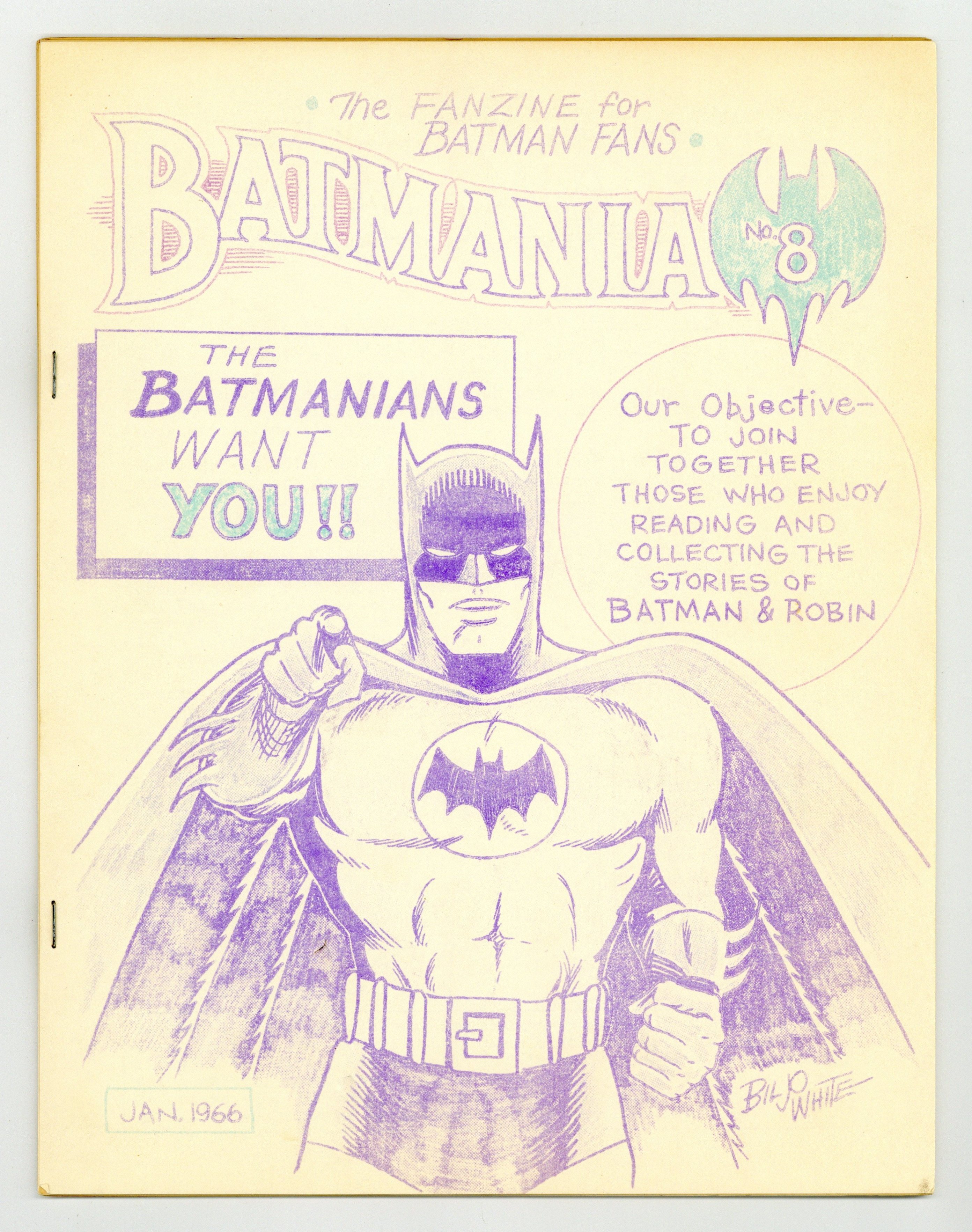 24-page mimeographed magazine published by Biljo White. Black-and-white with spot color. Features include "Evolution of the Batplane" pictorial, Reviews of Robin's solo adventures in Star Spangled Comics, plus some news.