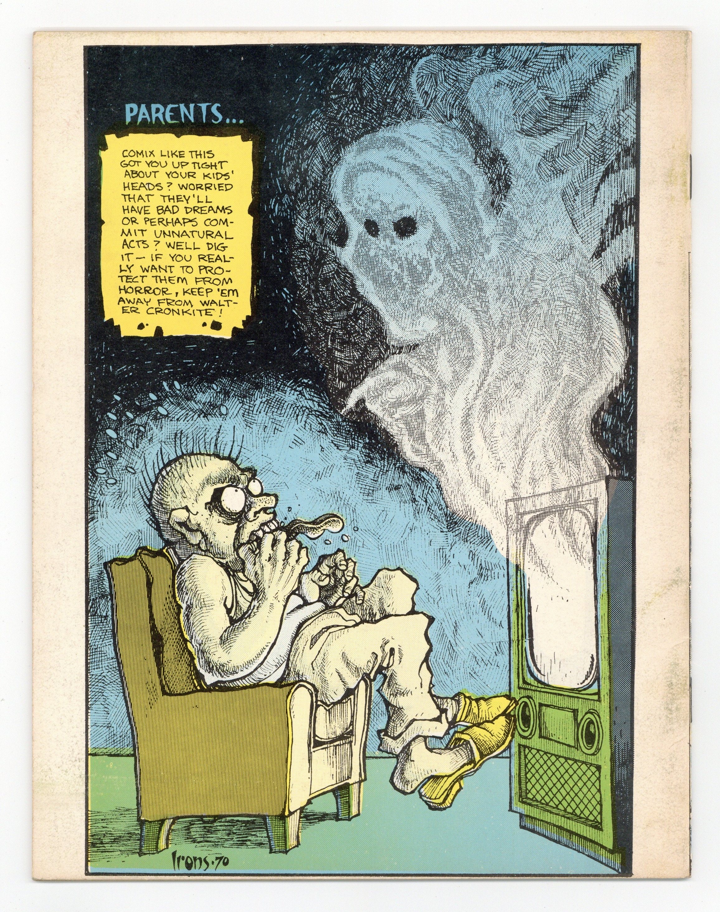 Influential early underground horror comix inspired by the EC horror comics of the 50s. Stories and art by Jack Jackson, Spain Rodgriguez, Greg Irons, Rick Griffin, and Simon Deitch. Note that while there was only one printing, the cover was printed in multiple variants, with some copies appearing red, orange, yellow or purple. Mature readers. 28 Pages, B&W. Cover price $0.50.