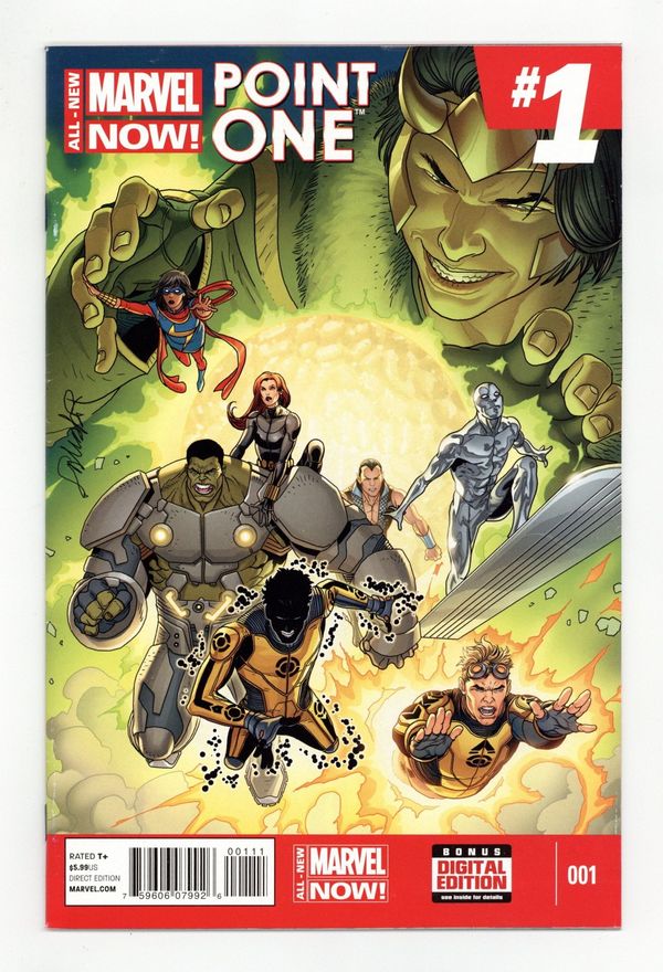 Cover by Salvador Larroca. Written by Al Ewing, Dan Slott, James Robinson, Nathan Edmondson, G. Willow Wilson, Nick Spencer. Art by Lee Garbett, Michael Allred, Steve Pugh, Phil Noto, Adrian Alphona, Rags Morales. Here we go again! It's your one-stop entry point to the world of ALL-NEW MARVEL NOW! Loki embarks on a mission for Asgard! The Silver Surfer and Dawn experience the cosmic rays of Nautikos! A Kree Pursuer and her Special Forces team prepare to invade the Earth! The Black Widow goes undercover in Russia! Who is the new Ms. Marvel? And can even the Indestructible Hulk survive the aid and assistance of fellow Avengers Cannonball and Sunspot? • Features completely new LOKI: AGENT OF ASGARD, SILVER SURFER, BLACK WIDOW, MS MARVEL, ALL-NEW INVADERS and AVENGERS WORLD lead-in stories! Note: First appearance of Kamala Khan as Ms. Marvel Cover price $5.99.