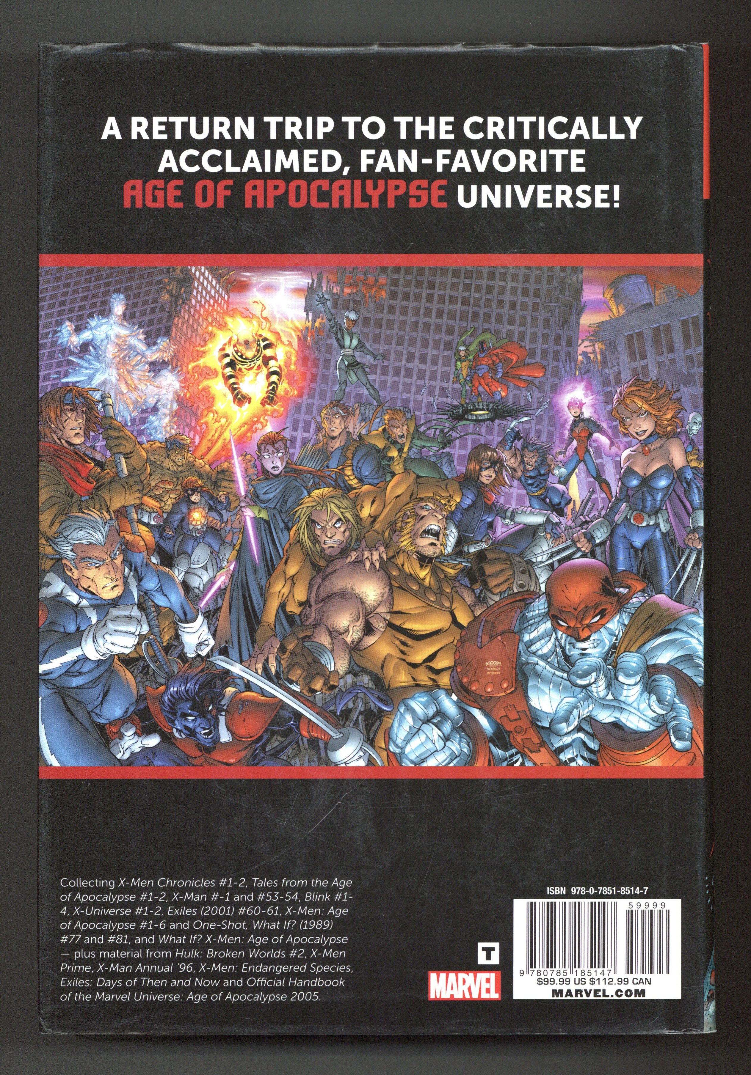 1st Edition - 1st printing. Collects X-Men Chronicles (1995 Marvel) #1-2, Tales from the Age of Apocalypse (1996 X-Men), Tales from the Age of Apocalypse (1997 Factor X), X-Man Minus 1 (1997), X-Man (1995-2001) #53-54, Blink (2001) #1-4, X-Universe (1995) #1-2, Exiles (2001-2008 1st Series Marvel) #60-61, X-Men: Age of Apocalypse (2005) #1-6 and X-Men: Age of Apocalypse One Shot (2005), What If (1989-1998 2nd Series) #77 and #81, What If X-Men: Age of Apocalypse (2006) - AND material from Hulk Broken Worlds (2009) #2, X-Men Prime (1995), X-MAN ANNUAL '96, X-Men: Endangered Species (2007), Exiles: Days of Then and Now (2008) and Official Handbook of the Marvel Universe: X-Men - Age of Apocalypse (2005).
