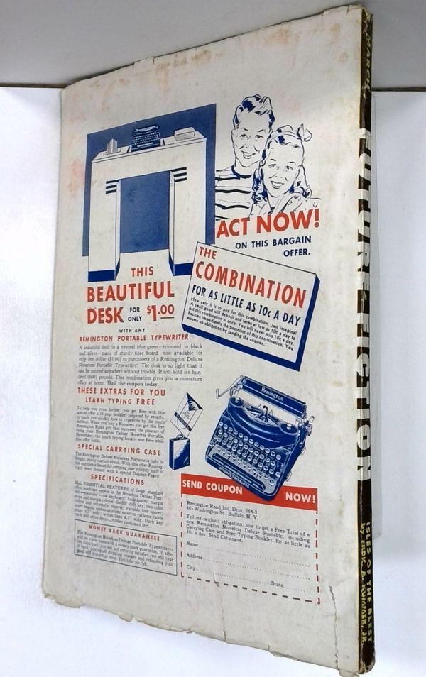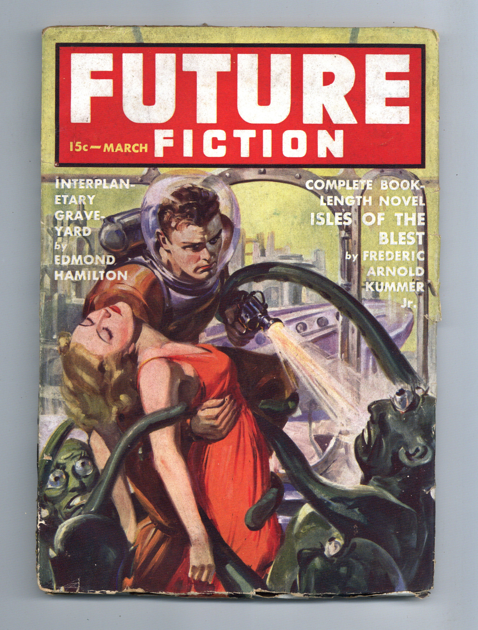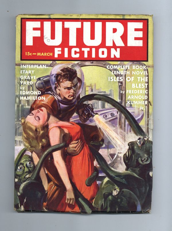 March 1940. Cover by J. W. Scott. Stories: "Isles of the Blest" by Frederic Arnold Kummer, Jr., "After Doomsday" by John Cotton, "Interplanetary Graveyard" by Edmond Hamilton, "As in the Beginning" by Jack Williamson, and "Ring Around The Sun" by Isaac Asimov. Softcover Pulp, 7-in x 10-in, 114 Pages, B&W. Cover price $0.15.