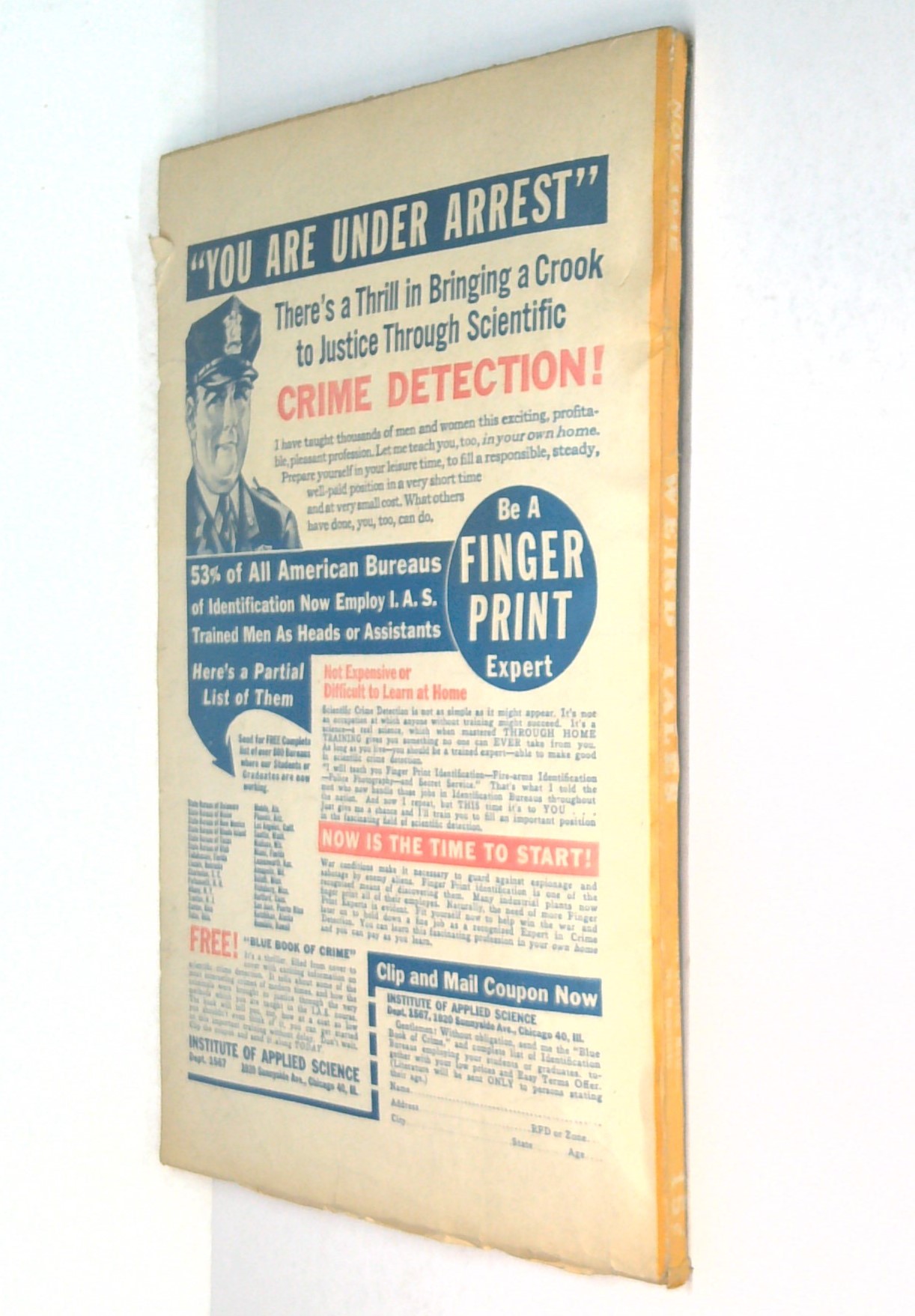 November, 1945. Cover by Lee Brown Coye. Horror and supernatural stories: "Lost Elysium" by Edmond Hamilton, "The Murderous Steam Shovel" by Allison V. Harding, "The Mad Dancers" by Roger S. Vreeland, "Mrs. Lannisfree" by August Derleth, "The Cranberry Goblet" by Harold Lawlor, "The Fangs of Tsan-Lo" by Jim Kjelgaard, "Soul Proprietor" by Robert Bloch, and "The Mirror" by Charles King. Verse: "Midnight Moon" by Stanton A. Coblentz, and "Superstitions and Taboos" by Irwin J. Weill. Softcover Pulp, 6 1/2-in x 10-in, 96 Pages, B&W. Cover price $0.15.