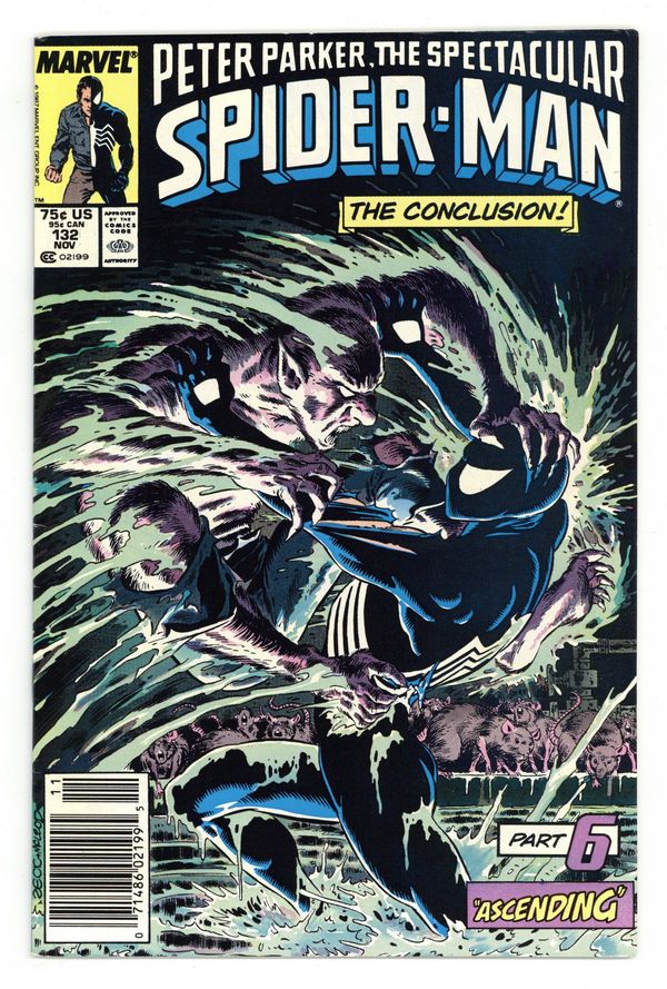 Mark Jeweler Advertisement Insert Variant. Kraven's Last Hunt - Part 6 of 6 - "Ascending" Script by J.M. DeMatteis. Art by Mike Zeck (breakdowns) and Bob McLeod (finishes). Story continues from Amazing Spider-Man 294. The hunt is almost over. Kraven is dead, but Vermin is still on the loose. Spider-Man must suppress his fears and enter the sewer to find Vermin. Can the web-slinger match Vermin's savagery and bring the rat-like killer to justice? It's an uplifting finale for the Amazing Spider-Man! (Note: This six-issue saga was reprinted as a trade book titled "Kraven's Last Hunt" in both 1989 and 2006.) 32 pages Cover price $0.75.