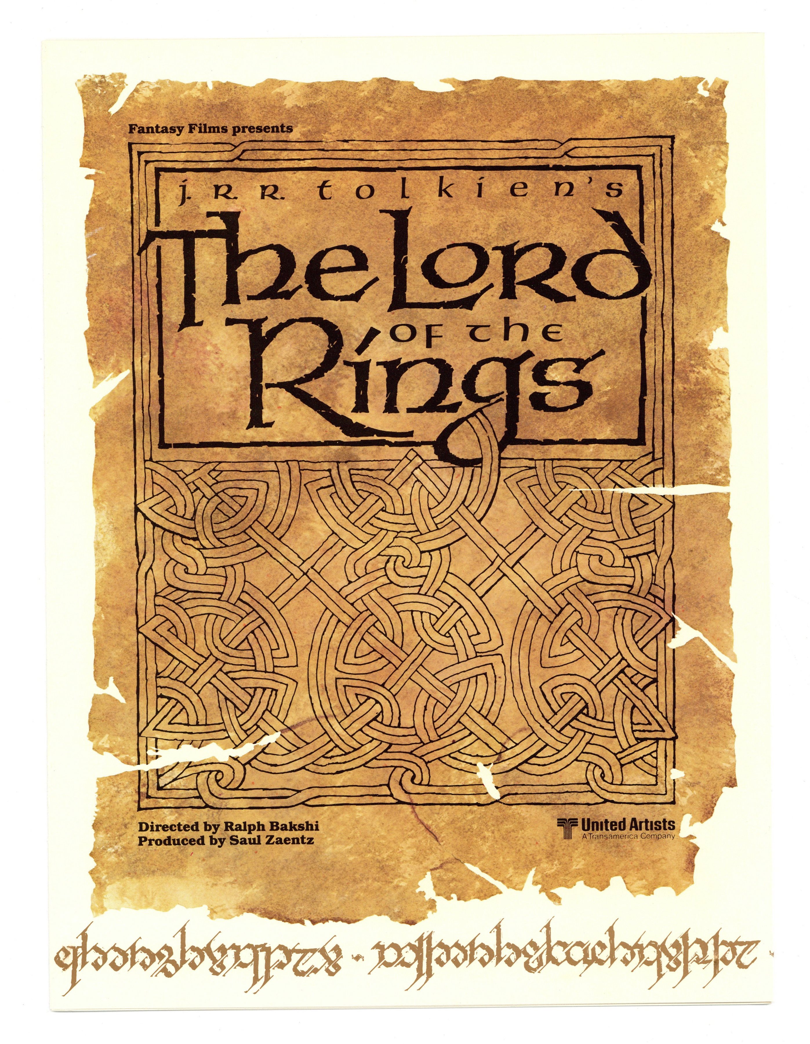 Original Promotional Fold-Out Brochure for the animated 1978 adaptation of J.R.R. Tolkien's The Lord of the Rings by Ralph Bakshi. Art by Mike Ploog. The fold out brochure measures 8.5 x 11.5 and unfolds to a massive 34″. The backside of the brochure has a single panoramic scene depicting the hobbits celebrating Bilbo Baggin's birthday. The front side of the brochure contains more concept art and talks about the new technique used to make the movie which involved filming costumed actors in live action scenes first, before taking the individual frames and animating them, creating an enhanced realism for the audience. 8 pages printed on heavy cardstock.