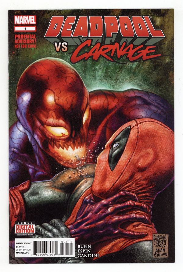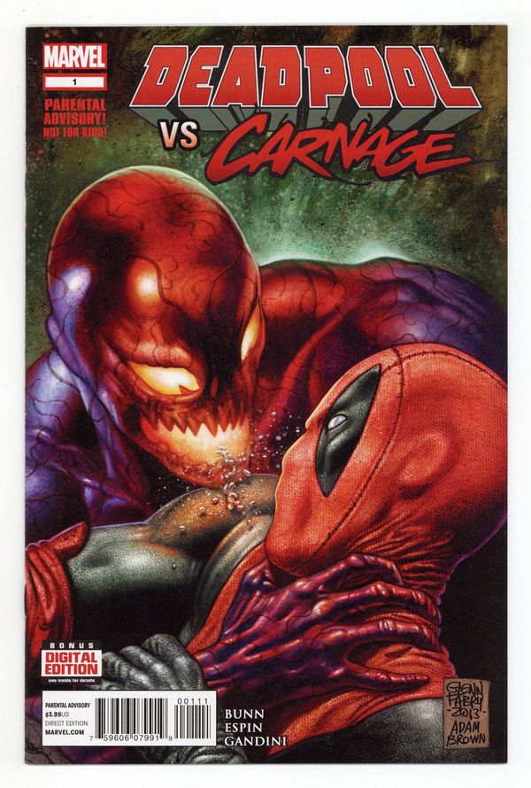 Cover by Glenn Fabry. Written by Cullen Bunn. Art by Salva Espin. Two red-suited madmen for the price of one! That's right-good crazy vs. bad crazy, once and for all! And you can bet it's gonna be a bloody one! Cover price $3.99.